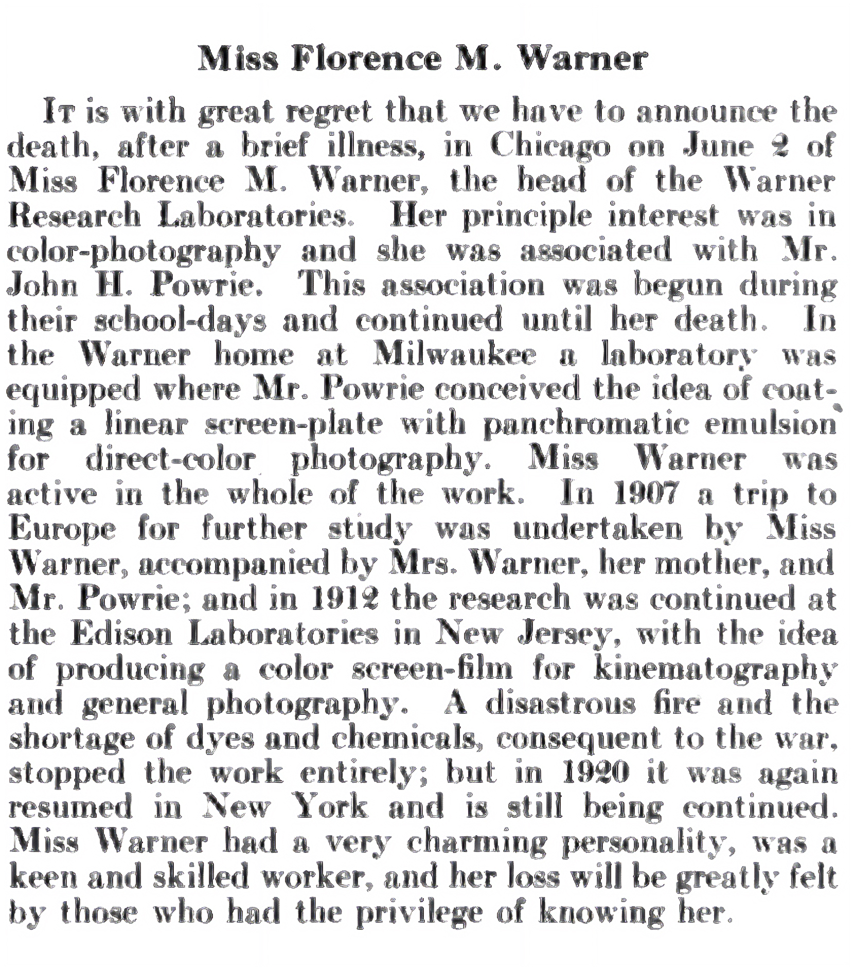 Warner and Powrie published articles about their discovery, including Powrie, J. H. The origin of the Warner-Powrie process and application of the Florence plate to process work in Penrose’s Pictorial Annual, 1905-1906, p. III, and 1907-8, pp. 9-16. She received further attention from the British Journal of Photography in issues of Oct 4 1907, Nov 5 1908 and June 4 1909. Each of the BJP articles recognises and speaks well for the Warner/Powrie attributes of vividness of colour and of finesse of detail which they rated above other processes.