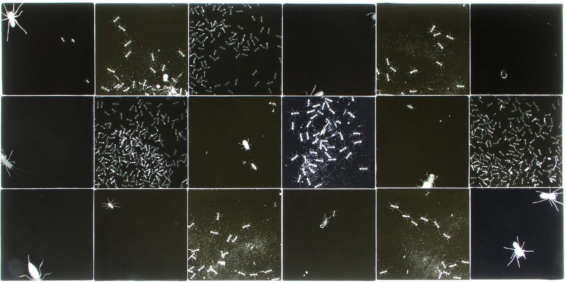 Nankin also gathered the moths, alive, from a summit cave at Mount Buffalo, capturing them at night on photographic films suspended behind them by exposing them with flash (no camera), resulting in black and white negatives on which were the shadows of the creatures at life-size. The sense of their vigorous fluttering is conveyed by a particular effect of the photogram by which objects touching the photographic surface are rendered sharper and, in the negative, as clear pure white (black on the second-generation print). Forms not actually touching the film become fainter and blurrier, which here include the wings of sitting moths and their companions who are in flight.