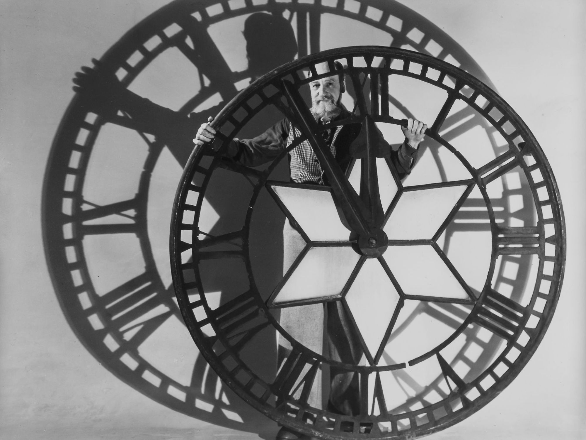 In 1945 McBean set up a new studio in a bomb-damaged building in Endell Street, Covent Garden in the midst of the theatre district. Exchanging his his Soho camera for £35 for a new half-plate Kodak View monorail camera which could accept his Zeiss lenses, he was ready for his first postwar commission, from Stratford Memorial Theatre to photograph a production of Anthony and Cleopatra. His former clients quickly returned and the theatrical community welcomed him back. In numbers of his later cards McBean poses inside cages and various other forms of entrapment, locked behind the frosted wrought iron gates of his Norfolk home or here, a prisoner of time behind a dramatically foot-lit clock face.