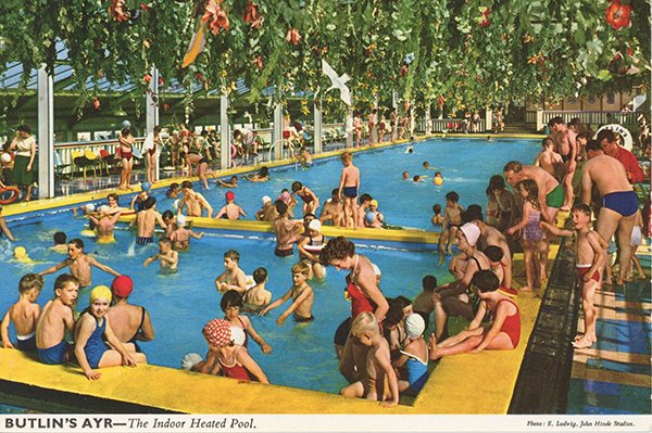 Hinde’s bright cards depicting English and Irish landscape were even then considered gaudy and kitsch by an audience used to staid black and white views. However his Butlins Holiday Camps series, were so in demand that by 1966 Hinde was running one of the largest postcard companies in the world with sales in excess of 50 million postcards (or viewcards as he preferred to call them) worldwide by 1972. Hinde’s success in the postcard business parallels the post-war expansion of the tourist industry.