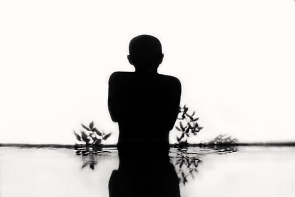 He creates his photographic works by constructing a ‘set’ of shadows, silhouettes and cut outs. He often creates the backdrops for the works using paper and inks and projects light or images onto them. In front of this real objects, or cut-outs are silhouetted against the shadowed patterns of trees or urban settings, and in this case the water is real, a tray of it placed into the set. Black and white film is used, and with heavy vignetting conveys a sense of time past. The photographs are not manipulated and constructed in Photoshop but are created ‘in camera’.