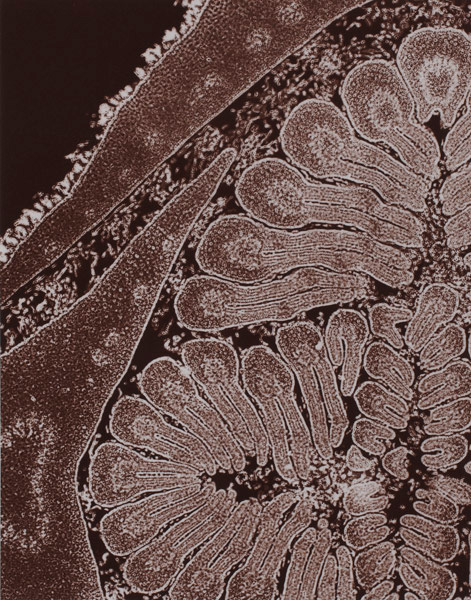 Laure Albin-Guillot took up photography shortly after marrying in 1901 and spent the next thirty years working with her husband in microphotography, and also photographing their friends who came from a wide cross-section of Paris society. The pair gathered and photographed crystals, plant cells, and animal organisms. In 1931, in tandem with her husband’s research in micrography and in collaboration with Pierre Fresson, and as a tribute to her recently deceased husband, she published a photogravure limited-edition book Micrographie Décorative comprising 24 photomicrographs of crystals exquisitely printed on various colored and metallic papers. Later, she and Fresson also collaborated on similar works, which were used as elements of interior design on the luxury liner Normandie.