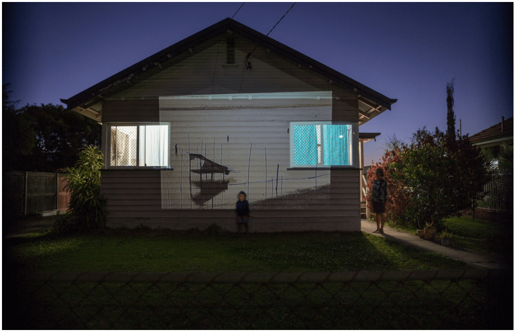 Her process is to project images the images of children in refugee camps that she has herself visited, onto ordinary Australian homes that now house the lucky few who have been given asylum here. The technique involves a careful balancing of remaining daylight, streetlights and shadows to make the images sufficiently legible. It is a thought-provoking reversal, for me, of projections inside suburban houses of the 1960s holiday slide shows of my shutter-bug uncles.