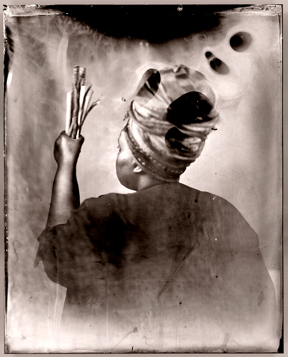 It is these qualities that make Saye’s tintypes, produced with the artist, Almudena Romeroso, relevant to Dwelling: in this space we breathe representing the migration of traditional Gambian spiritual rituals practiced by her mother.
