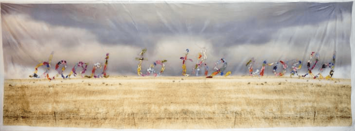 Ruth Maddison (2009) Dead to the world. Digital print on cotton/silk fabric, found fabric flowers sewn with cotton thread, approx. 130 x 371.4 cm