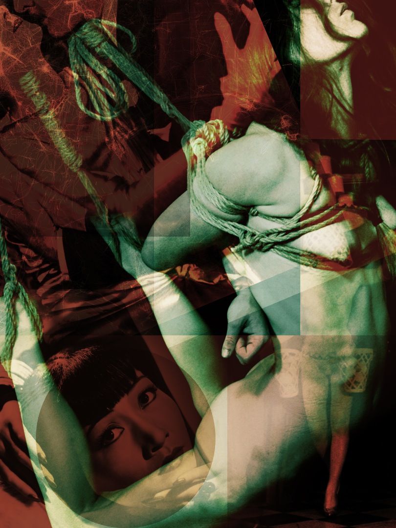 Recirculated imagery, drawn from all over the Internet, and spanning disparate cultures and past and present, are crunched together in an anarchic recombination. Multiple semi-transparent strata of mostly monochrome imagery – film stills and starlets, marching Chinese military, propaganda and pornography – are overlapped with tinted geometric forms, leaving no distinct subject. They thus induce paranoid anxiety.