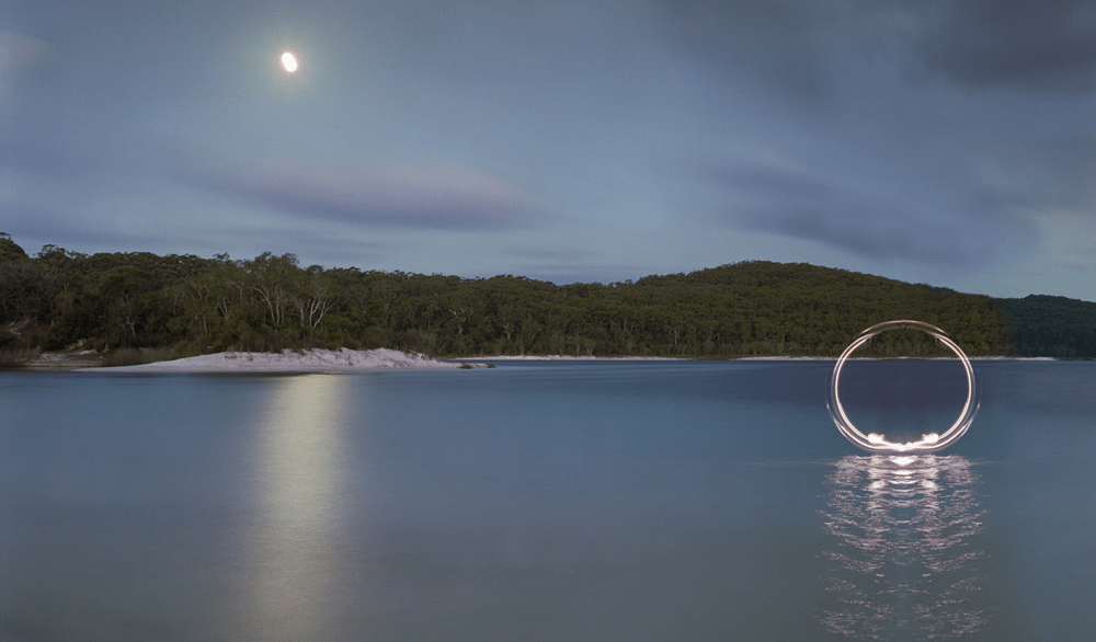 A floating apparition, a vessel, formed from skeins of light, hovers like a blazing premonition on the water of a mangrove. Lightning flickers on the horizon. The threat of the European ghost-ship is all the more present and distinctly located as its spectre is reflected, vibrating, in the water, and casts its hard glare on the surrounding sand, bush and grasses, planting sharp blades of light along the aboriginal shore. This is Marian Drew’s Moreton Island, the Creek that Leads to the Sea (2008). Drew describes a physically exacting process, in this instance, of drawing with light and motion as she stood in the water with a torch to animate the invisible history and politics of her landscapes.