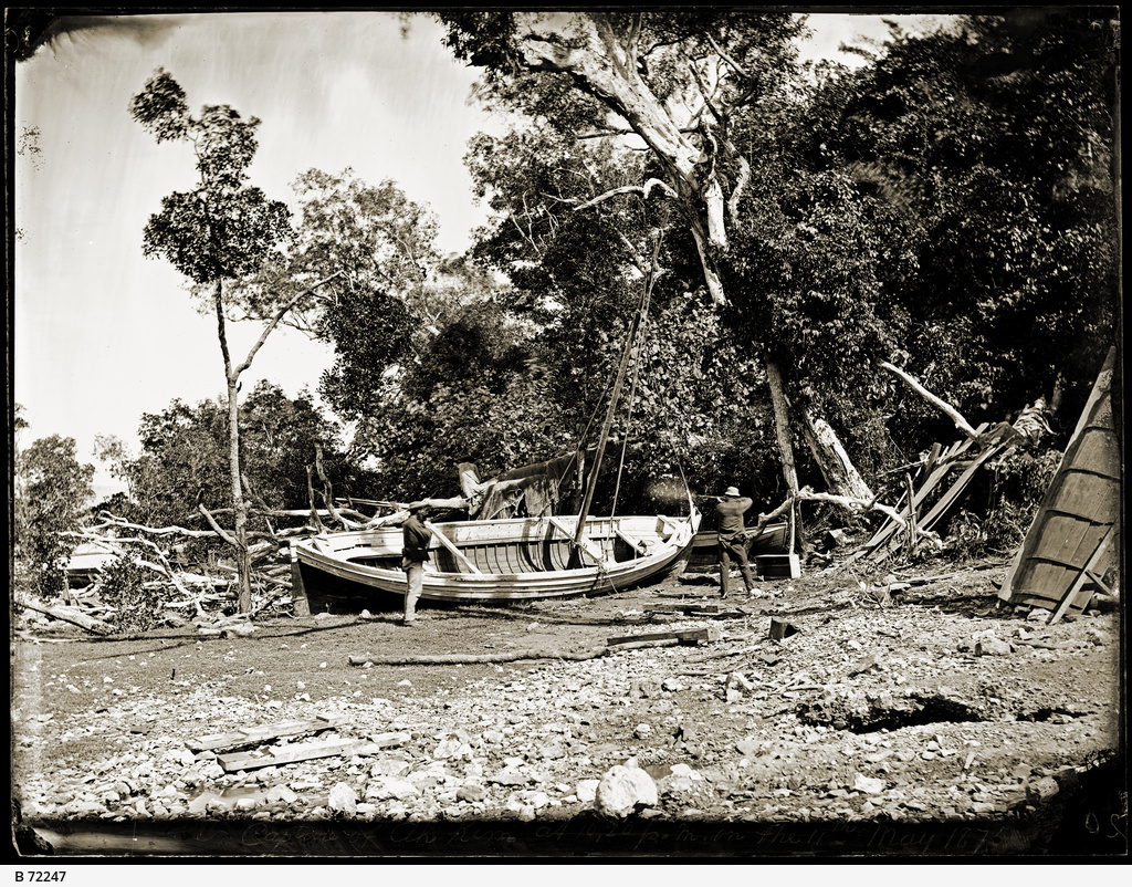 A reconstruction by Foelsche of the shooting of escaped Chinese prisoner Ah Kim during a police attempt to capture him in May 1875. Foelsche painted the puff of smoke from the policeman’s gun onto the glass plate. The falling figure of Ah Kim is represented by a stuffed dummy. Ah Kim was one of the first Chinese to arrive in the Northern Territory in 1871. He had a market garden at Yam Creek, then worked as a jeweller. During April 1874 he was arrested for theft and imprisoned without trial for a year. He escaped from the Palmerston Gaol in April 1875. His whereabouts was tipped off to Police Inspector Foelsche, who sent two troopers to apprehend him. They ambushed him on the evening of 11 May 1875 and he was killed by a policeman’s shot when he slipped from his hiding place above his boat and fell. He was not armed and not considered a dangerous criminal, and his treament and death caused public controversy.