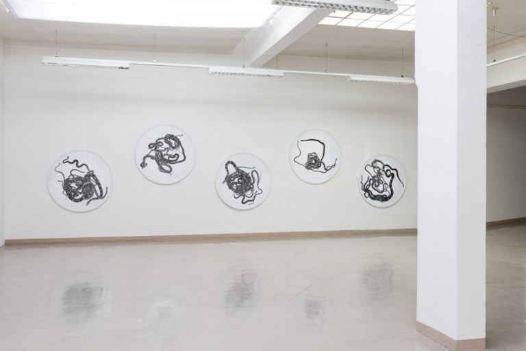 Gabriele Rothemann shows Schlangenmosaik, seen above as installed at Foto-Raum, Vienna in 2012 when the work was made. What appear to be tondos framing arabesque line drawings turn out on closer approach to have been live snakes, shot from above and barely contained by the crisp, circular frame.