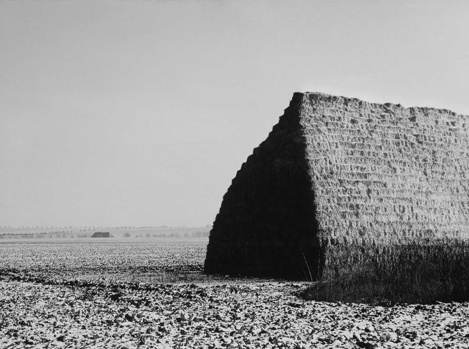 The stacks of hay bales are represented as Pyramids in a series of that name. Seen as pyramids they may be read as monuments to the agrarian production targets and ever-increasing quotas imposed by the communist state, but for Přeček they present a formal challenge that in 1961 he approached with an experimental negative print in which one is not certain whether the scene represents a summer, or snowcovered winter, scene.