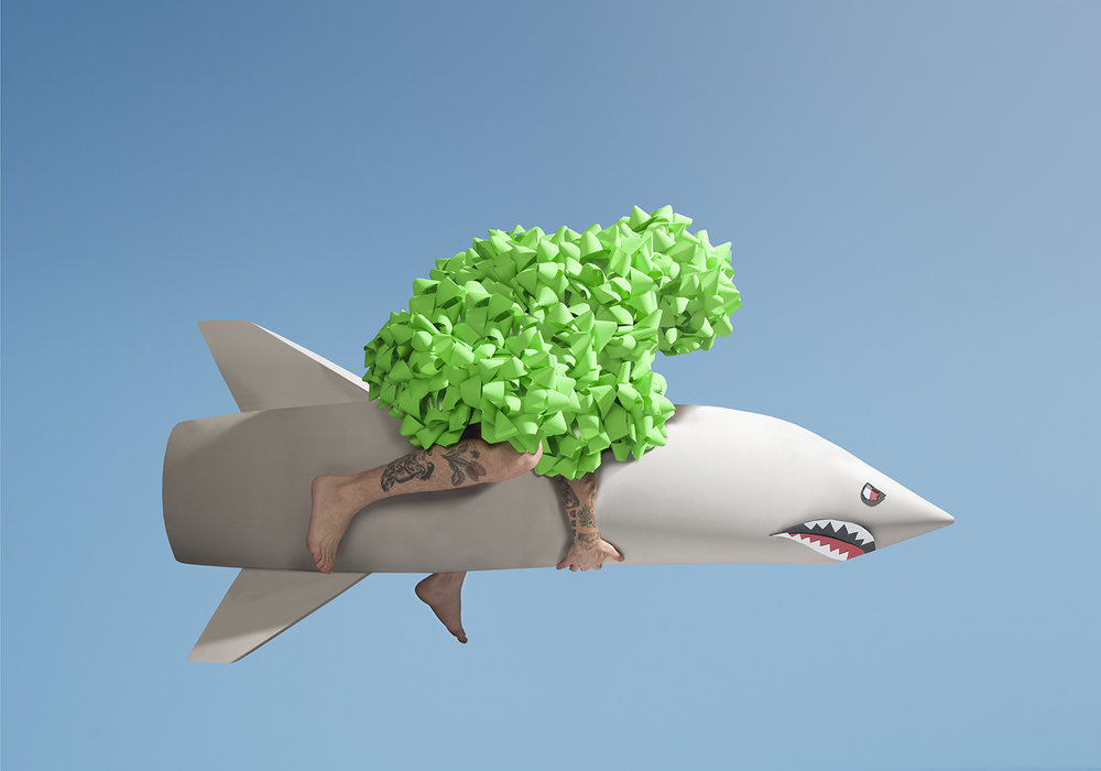 He borrows shamelessly from the Australian touristic phenomenon of the ‘Big’ of which there are estimated to be over 150 around the country, including The Big Pineapple, The Big Merino, and of course The Big Prawn, and he carefully matches the lighting and atmospherics of the location shot in his studio shot into which they are montaged; convincingly but with the same degree of exaggeration.