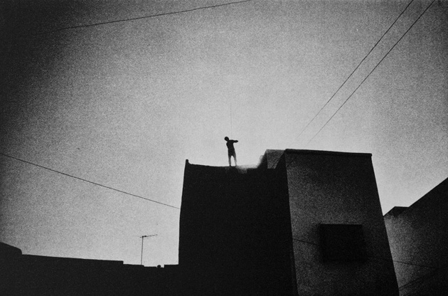 Nozolino’s symmetrical and balanced ‘day-for-night’ image, again shot contre-jour, shows two boys running toward the camera. Detail of the children’s matching striped tops (are they competing in a race?), and the cryptic graffiti ‘Hasib’, is subsumed by darkness, subjugated to a feeling of freedom and hope. That sense is supported by the accelerating perspective of the pavement, the movement of the figures and their relation to the gap between the buildings that reveals distant hills and clouds.