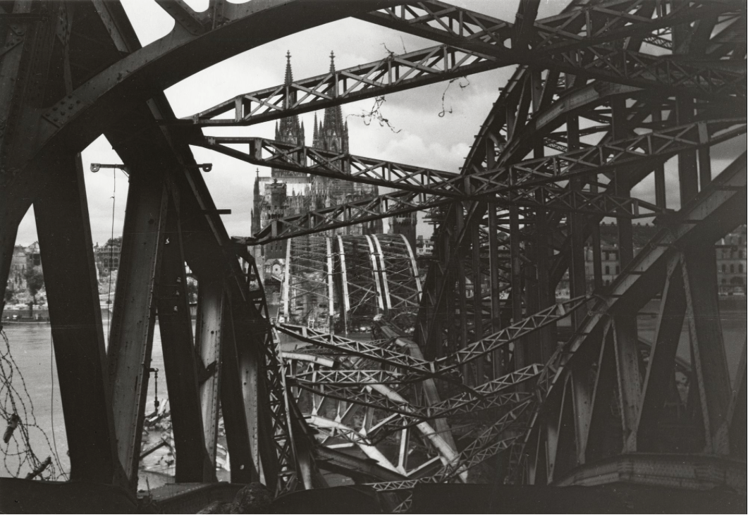 When Steichen visited Germany, it was a divided, defeated country and still in ruins. He selected work by Hermann Claasen (1899–1987), who had in 1947, with the support of Konrad Adenauer (then mayor of Cologne), released his photobook Gesang im feuerofen : Köln; überreste einer alten deutschen stadt (‘Singing in the Furnace: Cologne, remains of an old city’), containing his trümmerfotografien (rubble photographs) of Cologne after Allied aerial bombing. Most of his pictures show an uninhabited landscape, everything living, as Kurt Vonnegut put it, returned to a mineral state, a triumph of entropy.