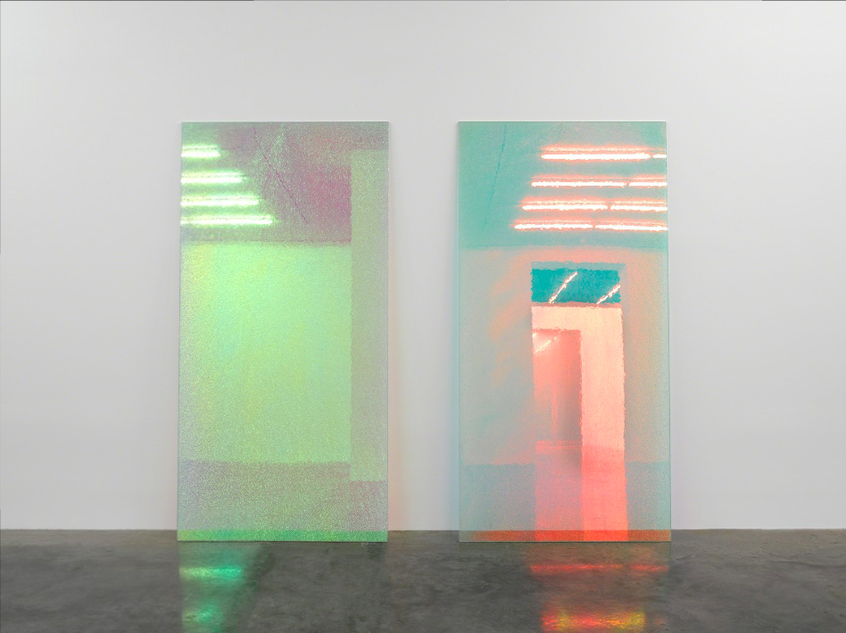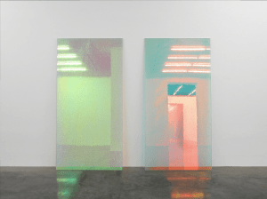 Ann Veronica Janssens (2013:2017) Magic Mirrors (Pink #2 & Blue), Dichroic polyester film, safety glass and float glass, 260 × 130 × 1.8 cm, unique work.