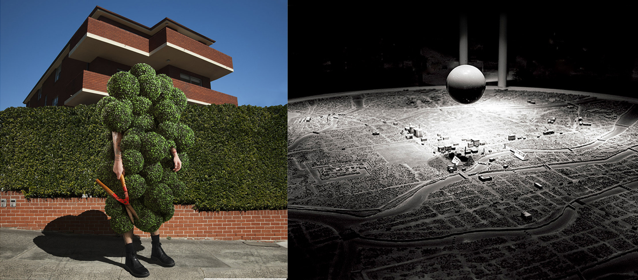 Jane Brown and Gerwyn Davies stood out for me as perfect for such an interview. To my joy, though both were very busy overseas, they consented. I had already identified a commonality. I had seen an early exhibition of Jane’s exquisite monochrome analogue prints, Australian Gothic, shown at Edmund Pearce Gallery in Melbourne in 2012. Amongst the range of Australian verancularity featured were gloriously kitsch architectural objects. One (above) depicted the Big Trout at Adaminaby near Lake Eucumbene in the Snowy Mountains, its giant form constructed in the early 1970s by an Andy Lomnici in fiberglass over a steel frame. Another was of a patchwork corrugated-iron garage facade shaped as a monumental map of Australia built to conceal the humble shed behind.