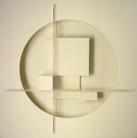 Construction in White, 1937 Wood, masonite, plastic, acrylic and plexiglass 80 1:4 x 80 1:8 x 18 1:4 in. (203.8 x 203.6 x 46.4 cm) Collection- Smithsonian American Art Museum , Washington D.C. Gift of the artist (1968).