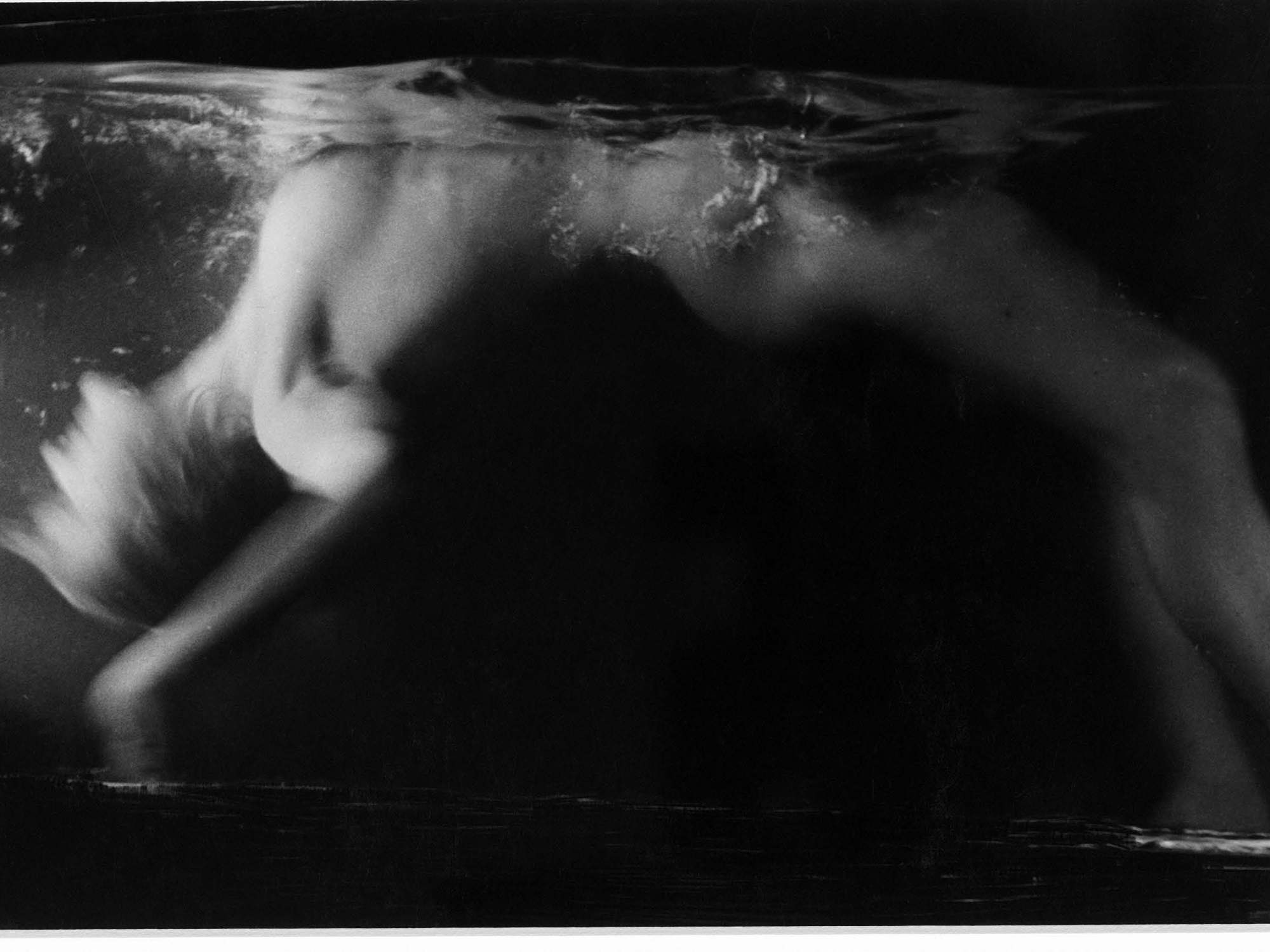 Amidst the Parisian intellectual milieu, she befriended the French and immigrant avant-garde creatives including the Surrealist writer and leader André Breton for whom in 1934 she photographed Jacqueline Lamba‘s performances at Le Coliseum cinema and dance hall at 65 Rue de Rochechouart where several times a week she could be seen swimming naked. Rogi made the pictures using a mirror angled under the water (the edge of the mirror can be seen in the picture at the head of this post). One was published to accompany Breton’s text in Minotaure and subsequently reproduced in his L’Amour Fou.