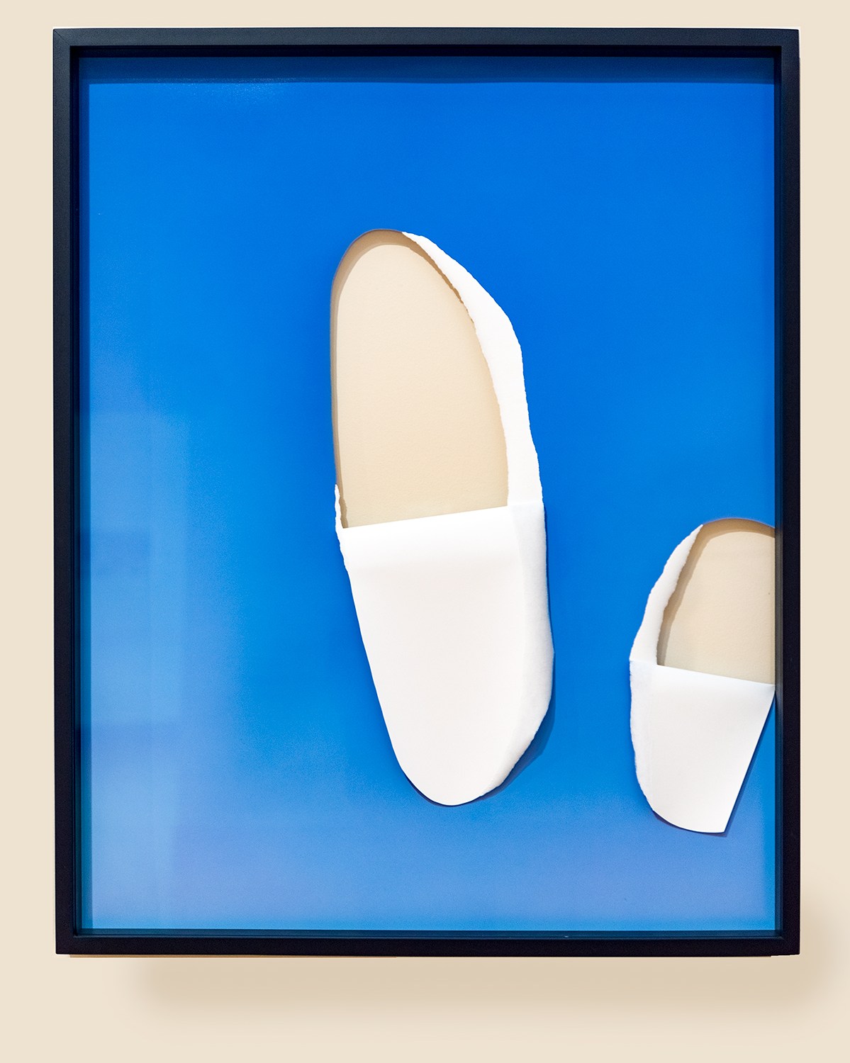 Importantly here, they return us to Balzac’s “spectra”, his “foliaceous”, gossamer films of essence, through Gojak’s demonstration that a photograph, in its full and credible depth of rendering, is merely thin emulsion, a physical thing, yet vanishingly insubstantial. Accompanying them is a sculptural form, a slender armature around which Gojak has densely and patiently wound a single thread of sky blue as of the pigment of the now unravelled dimensions of the mirage, as if it were a kite, and the string, a futile means of tethering it.