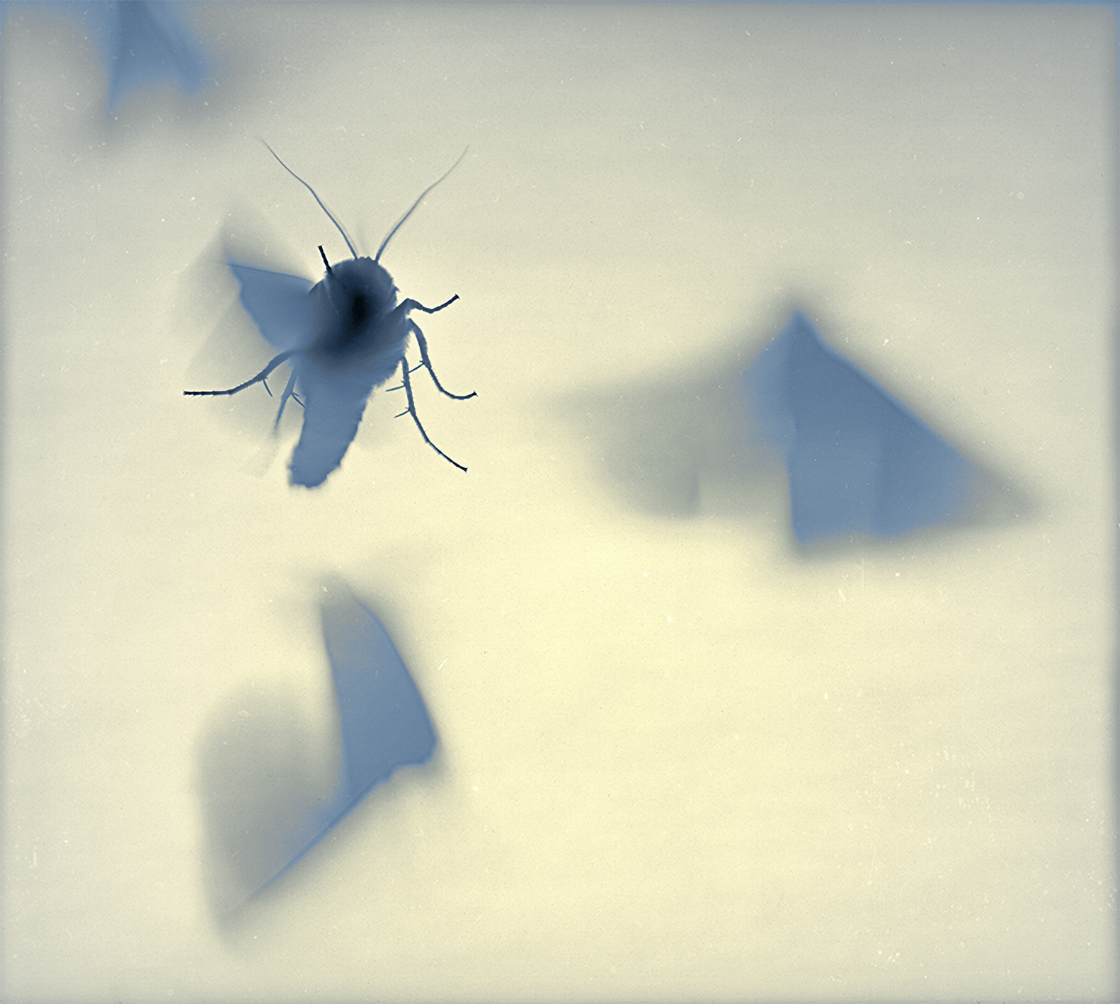 Nankin has since 2011 recorded the moths’ arrival in the Alps using camera-less photography with electronic flash to make photograms of them in flight and in social clusters, later digitally rendering the images as positives in which the legs of the lepidoptera clinging to the emulsion in-situ appear sharp and their beating wings blur. Their fragility, and their thinning ranks, are made poignantly evident.