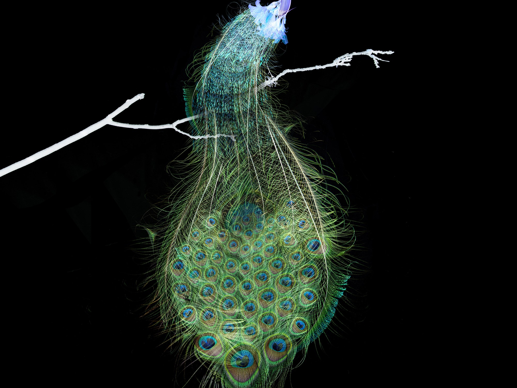 The colours are not in its feathers. They are produced by light refracted from the feathers’ minute, overlapping barbules; one million on each tail feather. Three layers of keratin tune an interference pattern as light reflects from their front and back surfaces, out-of-phase, shifting the wave frequency dark purple in the ‘pupil’ of the eye, blue in the ‘iris’ of the eye, bronze around the iris and green on the fringes. Like a hologram, the colours change with the angle of view.