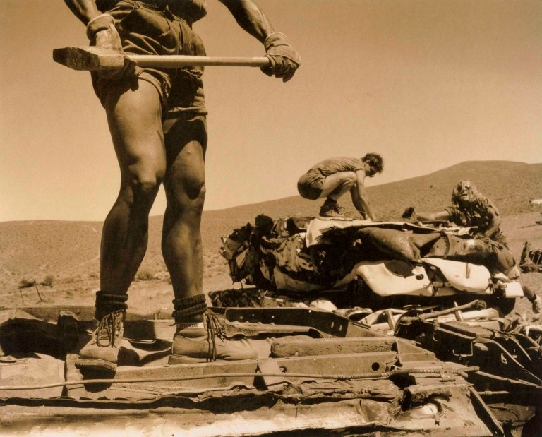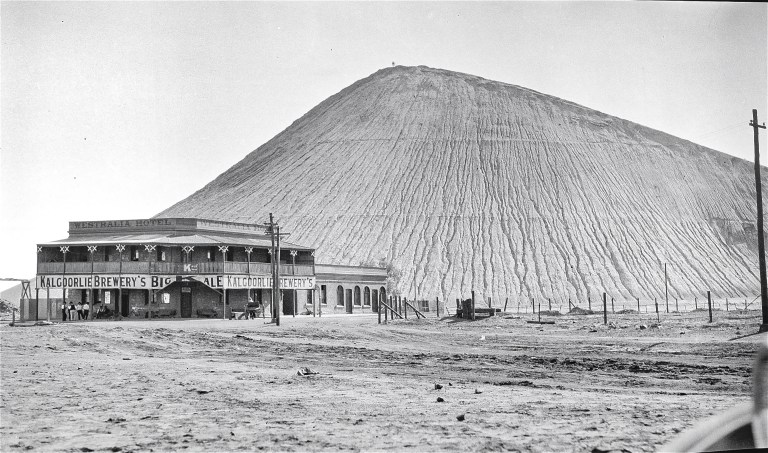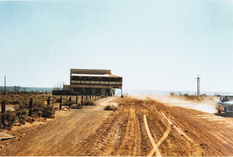 Point-of-view in Drysdale’s photographs is as important, then, as colour. He orients us in Boulder City so that we interpret its location as Moffatt does. Another view, taken 50 years before and from 30 degrees the right, shows the Westralia Hotel not before a flat lonely horizon, but with a large mound looming over it, on which, for scale, perches a double-exposed single figure. It is one of the artificial mountains of tailings built of waste dug from beneath the ground where there were more than 3,000km of gold workings. The hotel, still in operation when Drysdale photographed it, and its surrounding town Kamballie, were swallowed up in the 1980s by Kalgoorlie Consolidated Gold Mines’ Fimiston Open Pit, now known as the Super Pit.