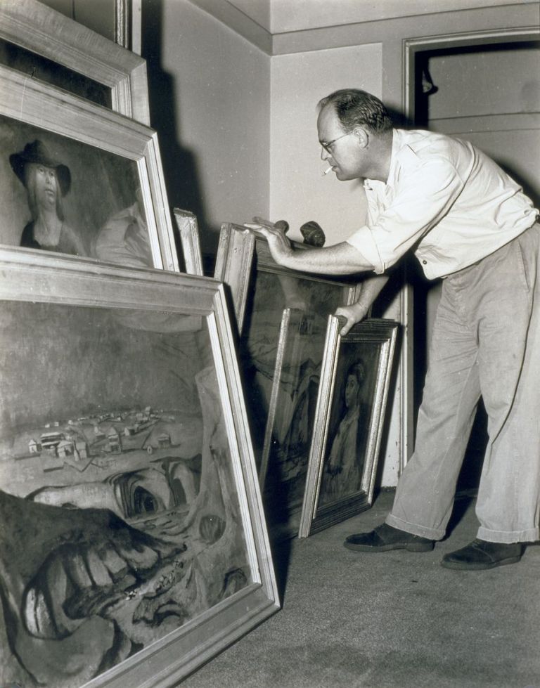 Scrutarius concludes that the introduction written by artist and Sydney Morning Herald critic, Paul Haefliger, “attempts to explain [the paintings] and even to turn Drysdale into a sort of intellectual romanticist.” Haefliger (left) was photographed reading in his studio by Drysdale who visited him and his wife Jean Bellette; the journalist’s newspaper acts as a reflector of warm afternoon sunshine to emphasise a sense of his private, relaxed absorption.