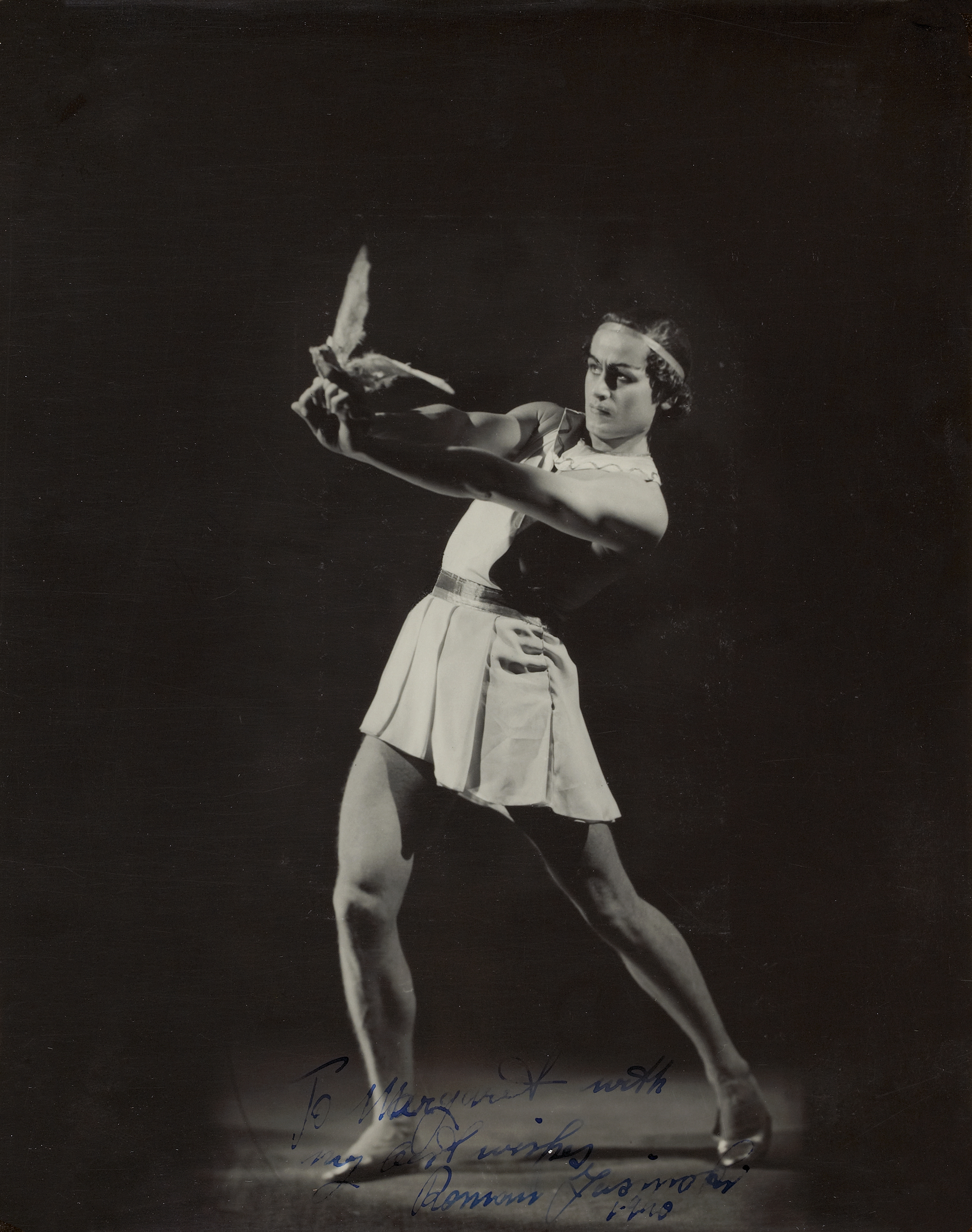 Roman Jasinski in Icare 1940 gelatin silver ; 24.3 x 19.2 cm. Ballets russes de Colonel W. de Basil stamped on verso- Noel Rubie Pty Ltd. Inscribed in ink l.c.- To Margaret with : my best wishes : Roman Jasinski : 1940.