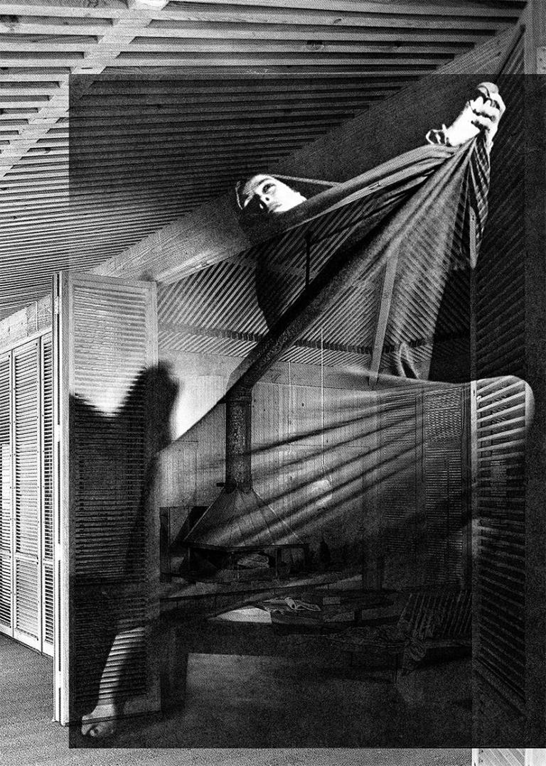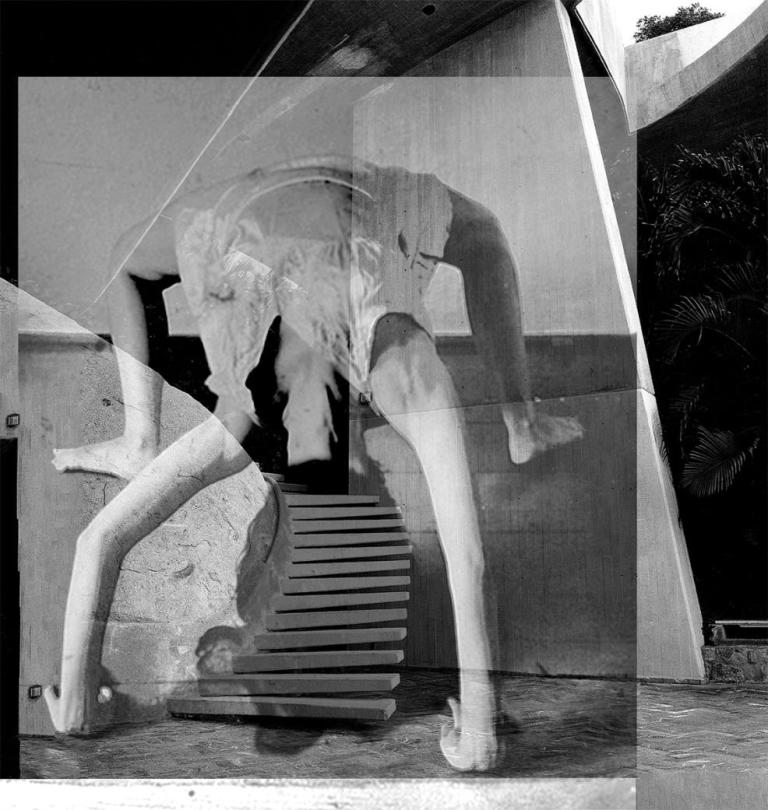 I’ve got a huge collection of books and noticed, quite organically, that I was attracted to books on the human body, especially in theatre or dance, and also modernist architecture. Combining the two felt like a natural connection. One image I used for the experimental print prize was one such found image. I knew what I wanted to happen. There’s a lot of things going on in that piece in terms of what I’m referencing and what I was inspired by, but specifically I wanted a figure that would back bend down the stairs with the hair cascading down the bottom of the steps.