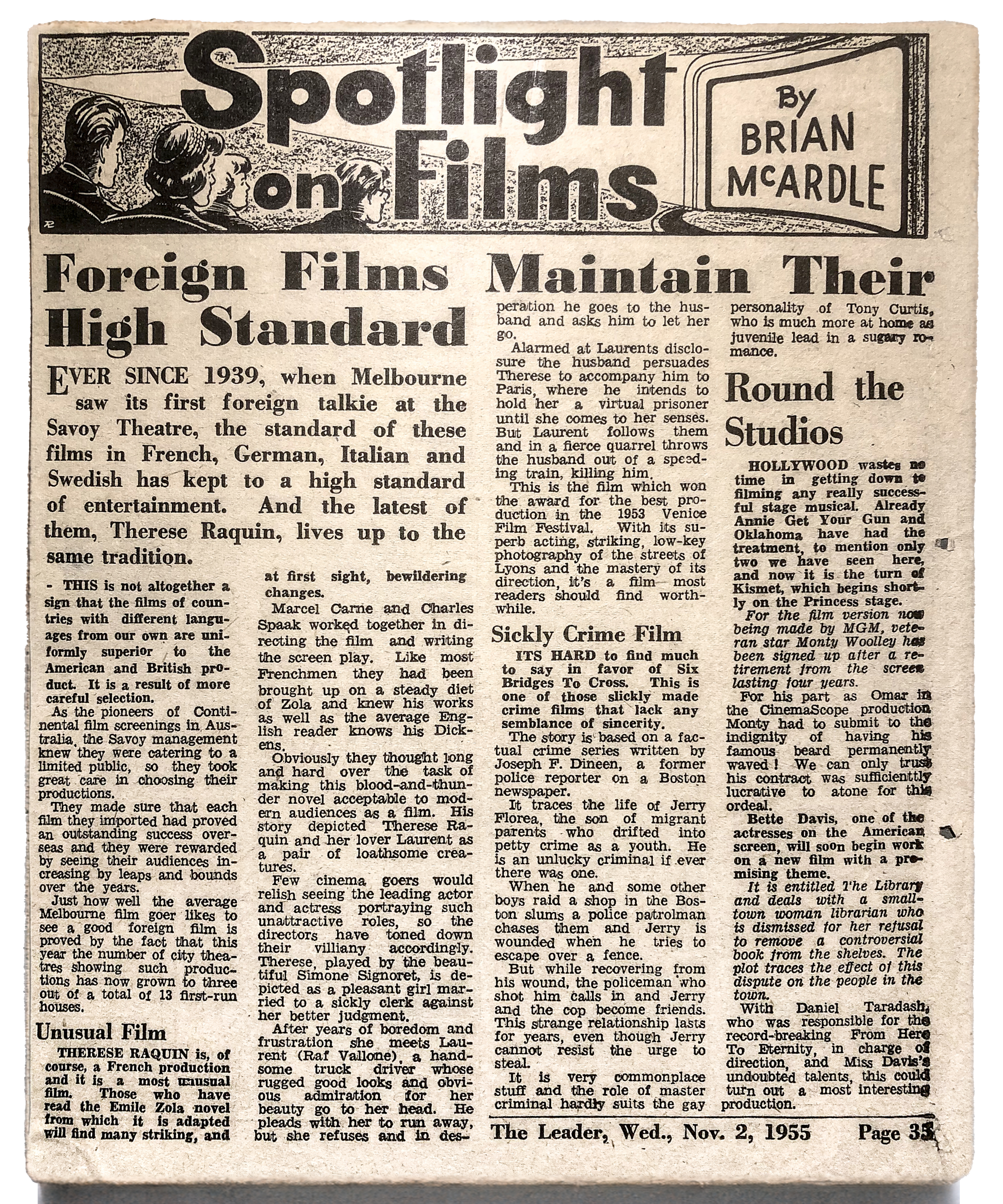 From November 1953  he replaced Bruce Grant as film critic on The Age and with his own column “Spotlight on Films” in its ‘companion’ weekly, The Leader, he personally favoured European films over Hollywood productions, as he does in the cutting I have below.