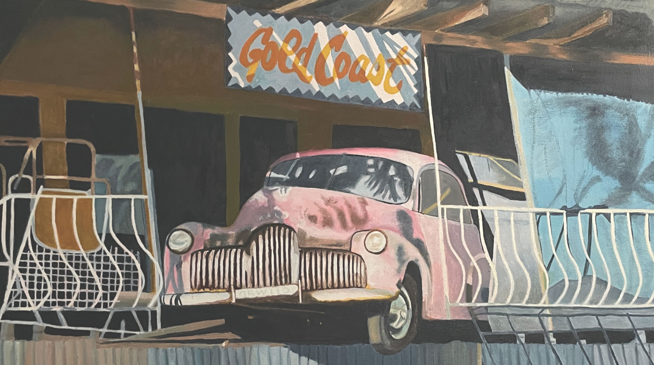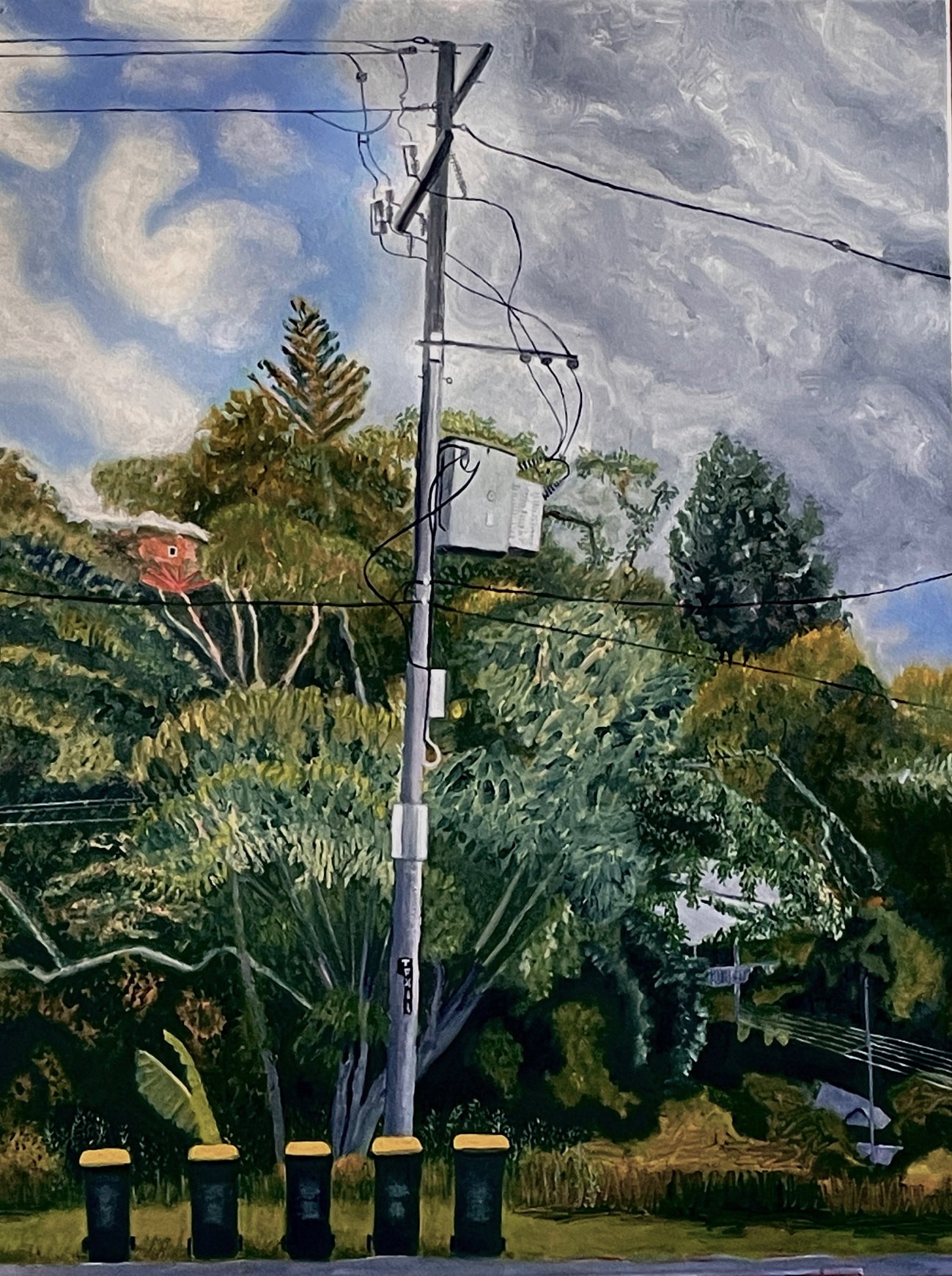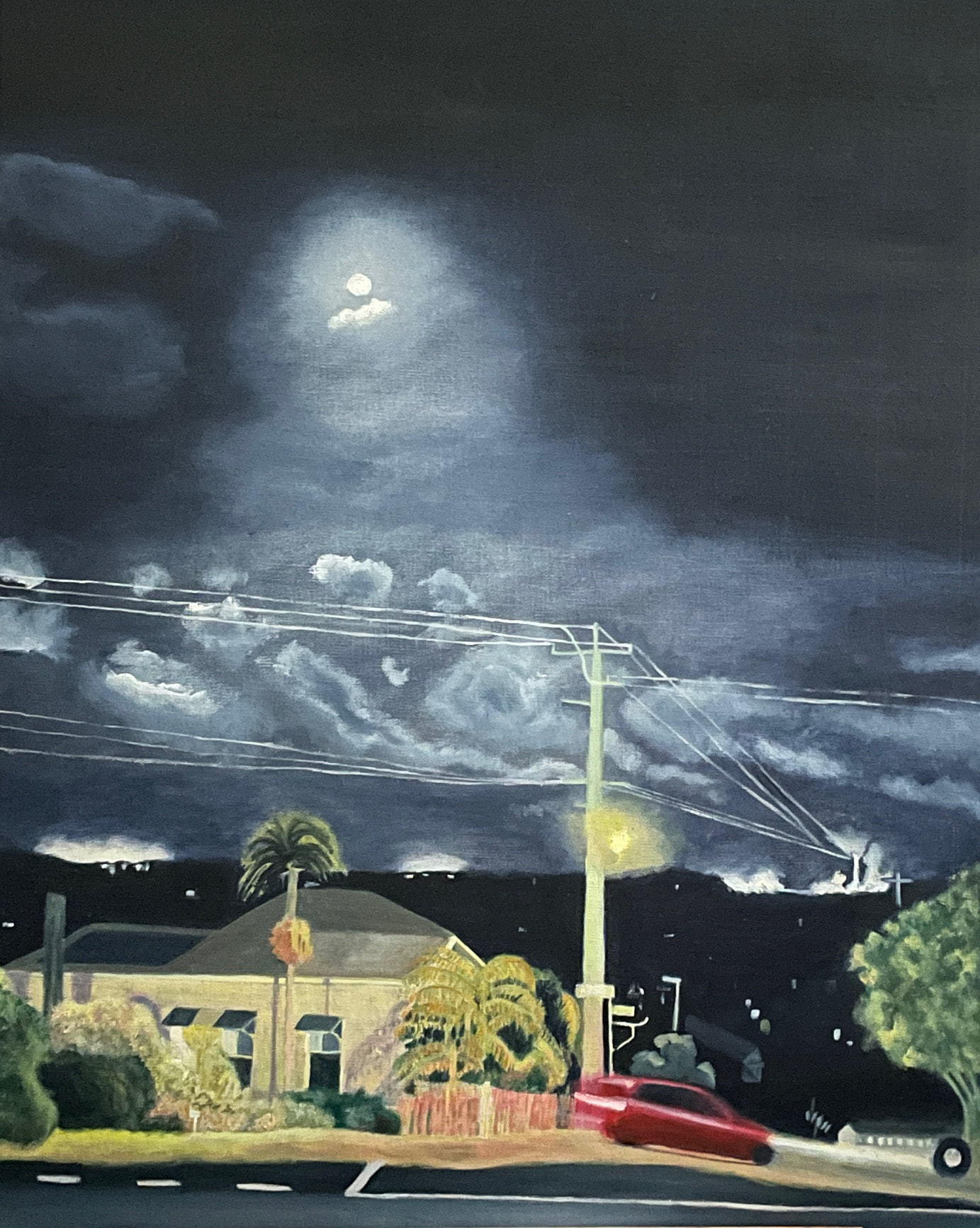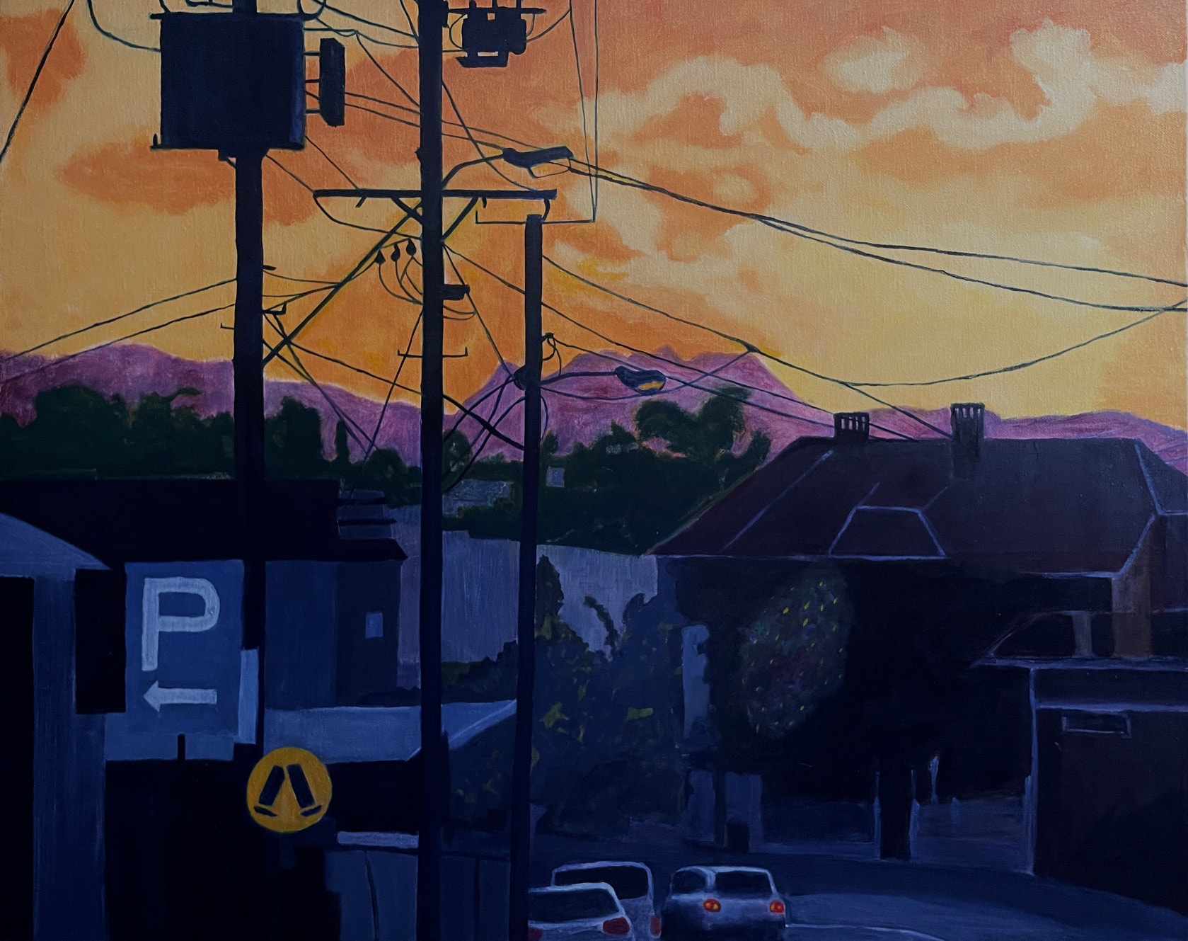 “I want my paintings to work through pictures of the regional built environment to evoke issues beyond locality. By including street signage, light poles, and motor vehicles in my paintings I hope viewers might reflect on the historical and physical processes that shape our environment, and where they are going.”