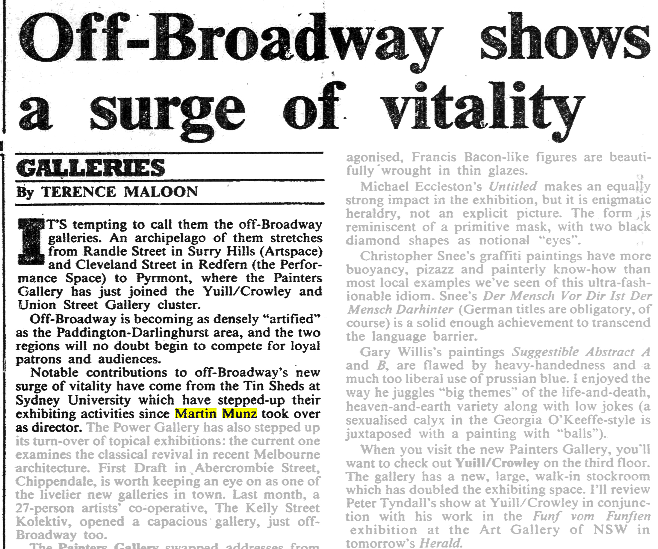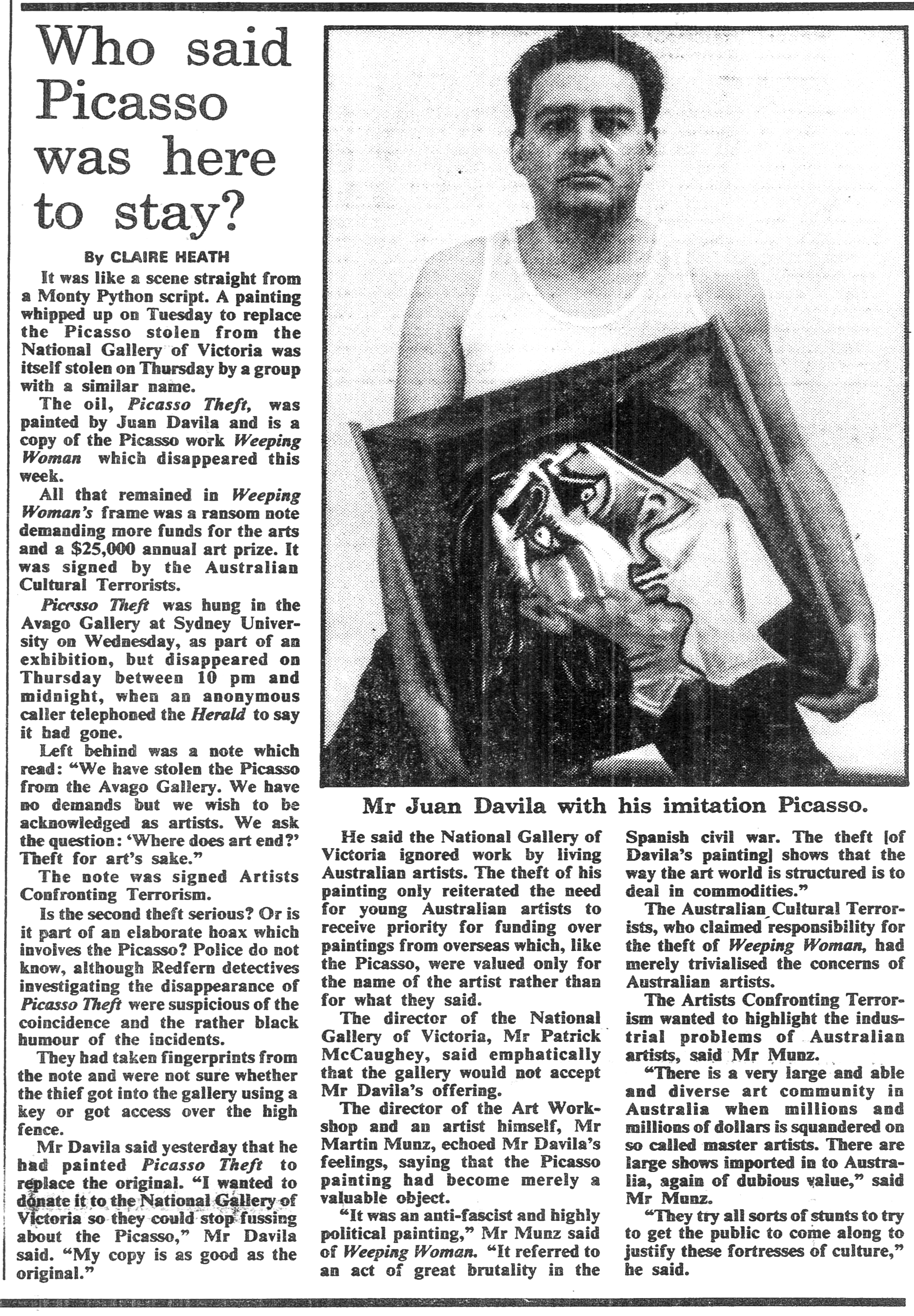 For its inaugural show, Avago Gallery played a peripheral role in the scandal of the Weeping Woman theft from the National Gallery of Victoria in 1985 when it exhibited Juan Davila’s copy of the stolen painting some few days after the theft.