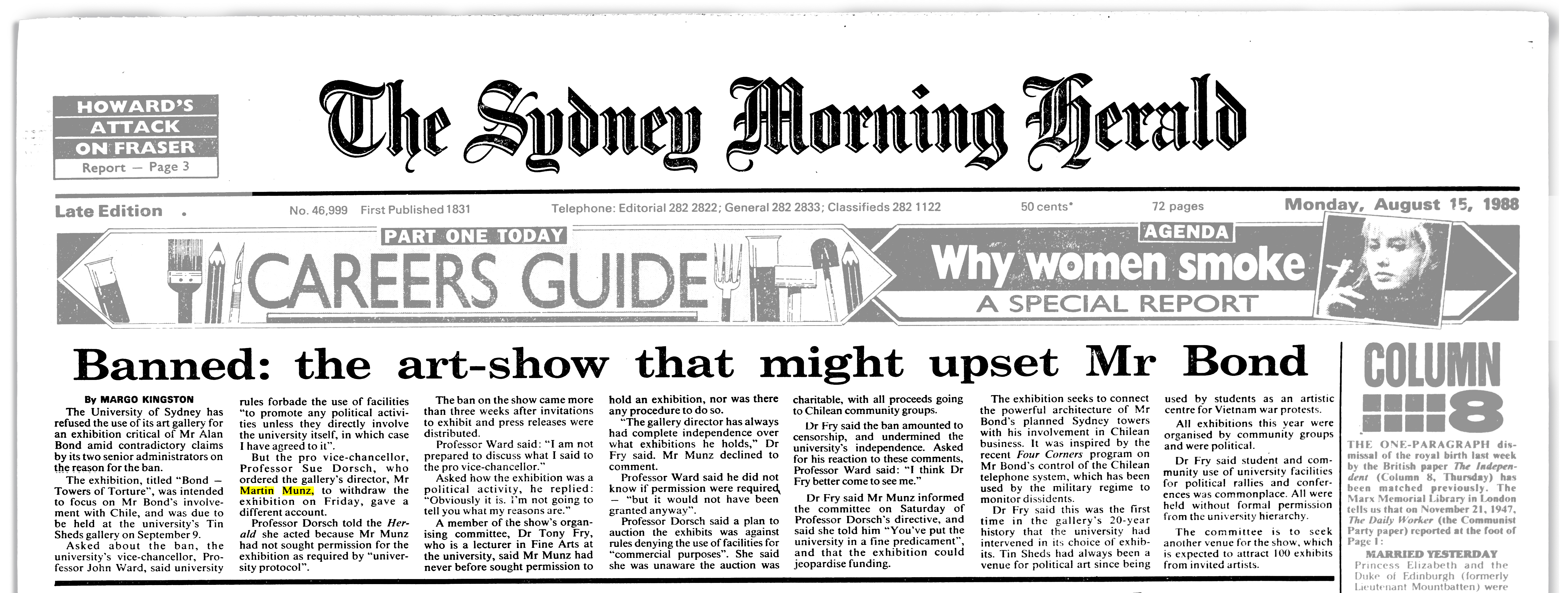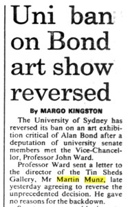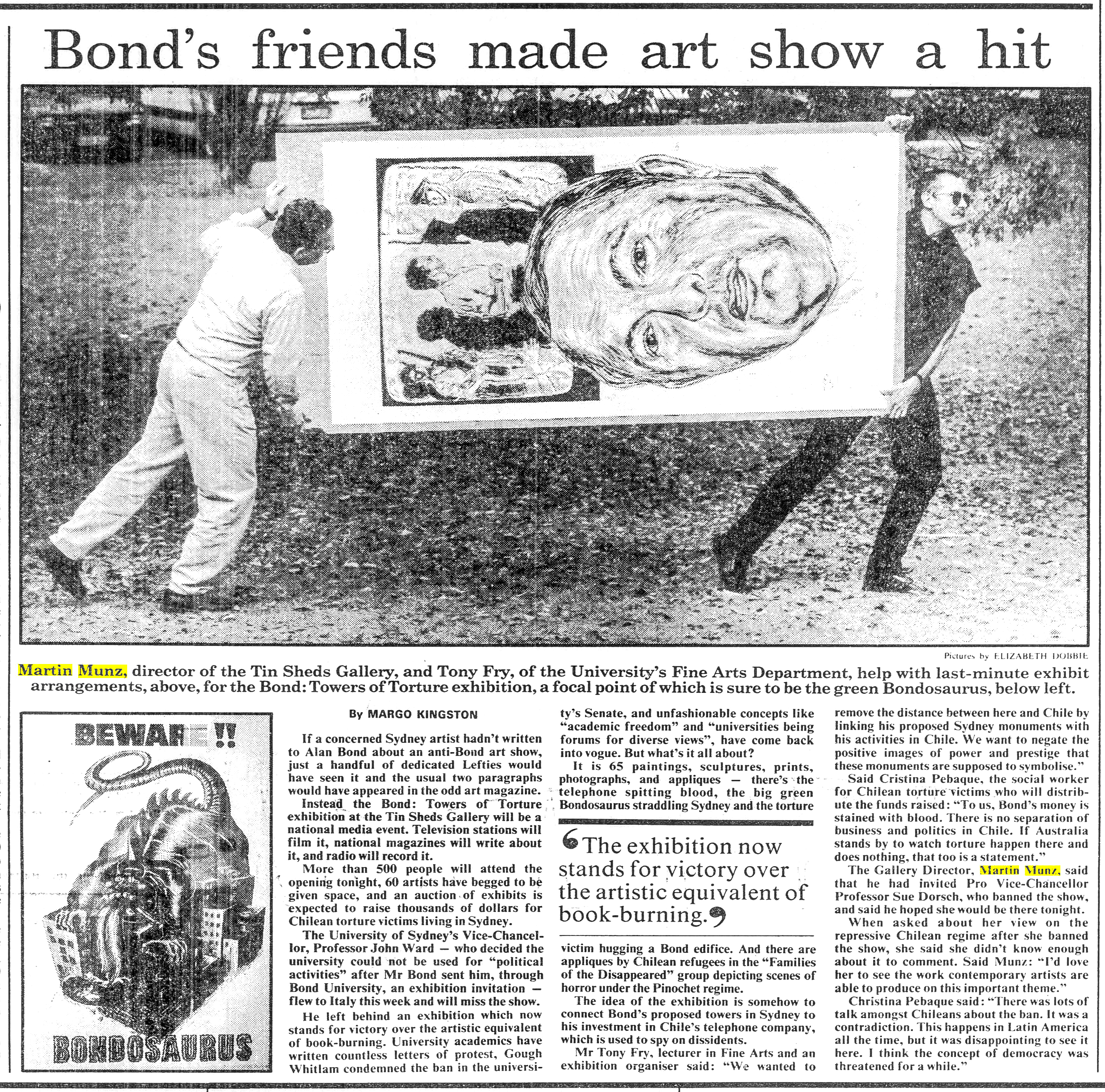“However, that scandal was eclipsed when the university instructed me in September 1988 to stop an exhibition Towers of Torture in support of Chilean political prisoners themed around architectural design and repression; appropriate subjects for the Sheds given our institutional setting and history of political engagement. That show was prompted when Alan Bond, then owner of the Chilean telephone system which was compromised by its association with Chilean dictator Pinochet’s security police, proposed a multi-storied building in the Sydney CBD (now ironically named the Chifley Centre). I could not follow the instruction to effectively ban the show, and then it became apparent that Bond Corporation via Bond University had influenced executive officers at the university to axe it.