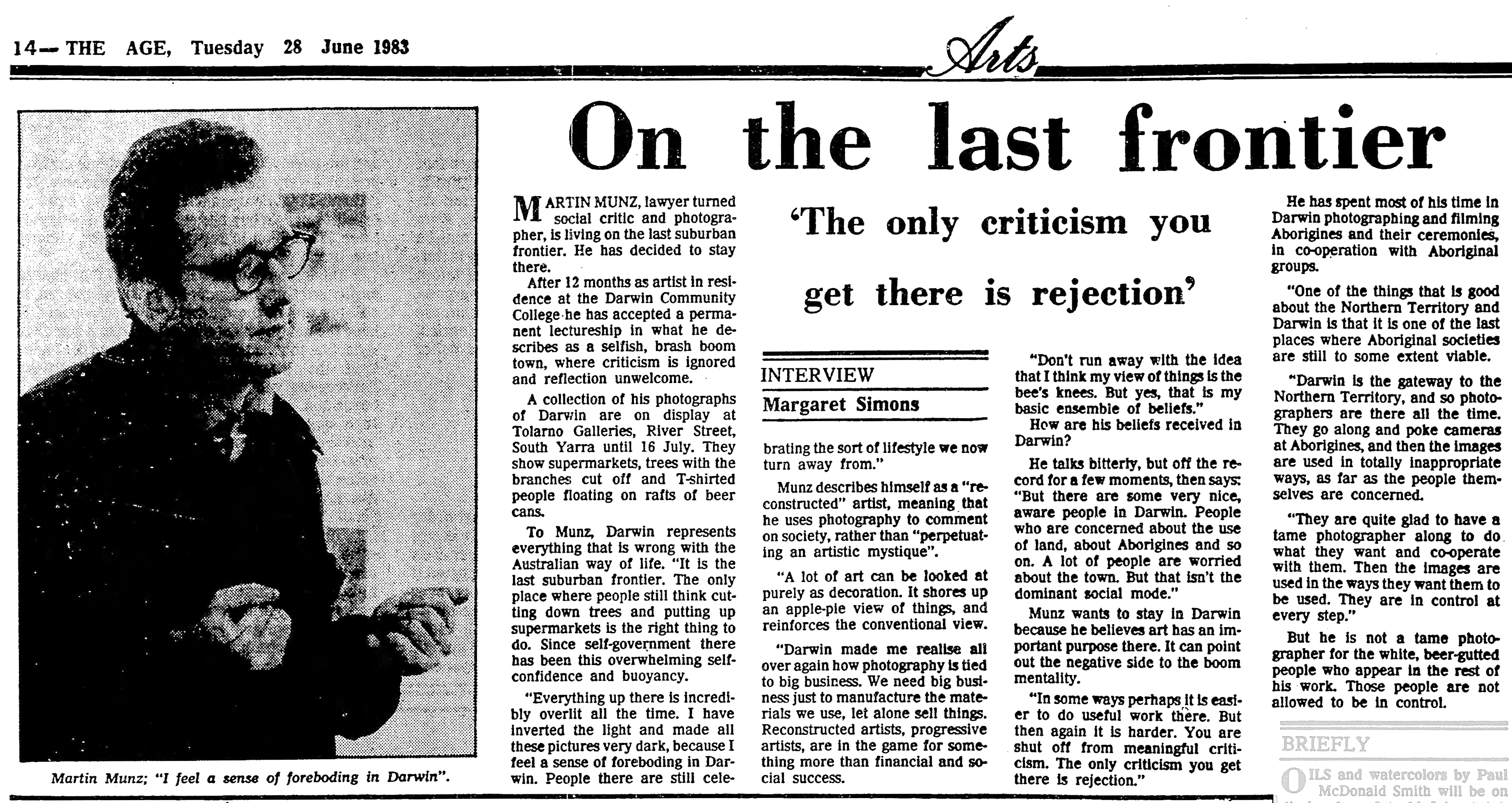 Margaret Simons, interviewing Martin for The Age in June 1983 noted how he photographed and filmed First Nations peoples around Darwin and their ceremonies in cooperation with Aboriginal groups: