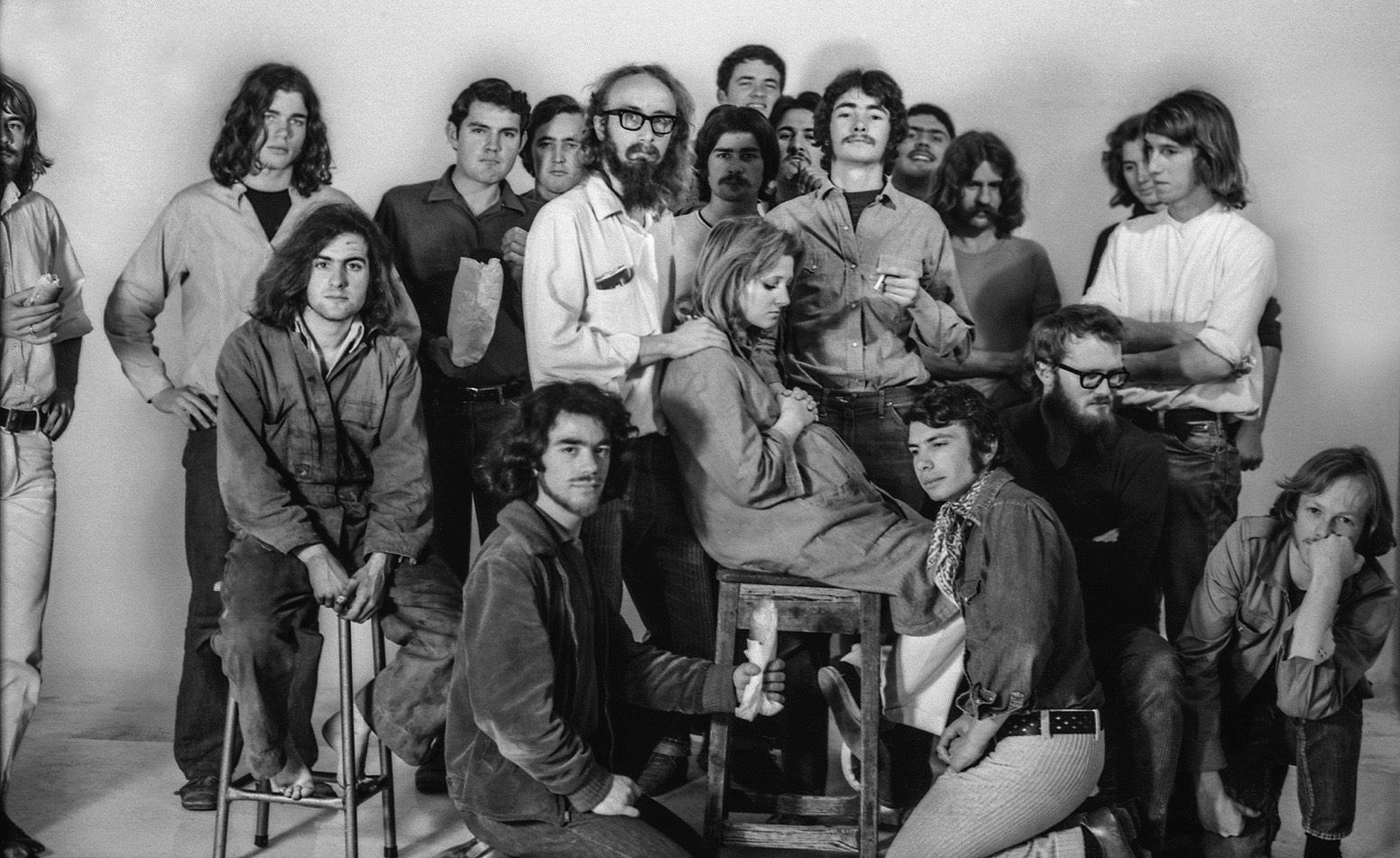 In retrospect Peter considers that “perhaps I was too cynical about assignments that De’Lisle gave us.” For one titled Family, his response was to photograph one “pregnant” woman, Meryl Greaves, with the male students, each reacting differently to the possibility that they might be the impending father.