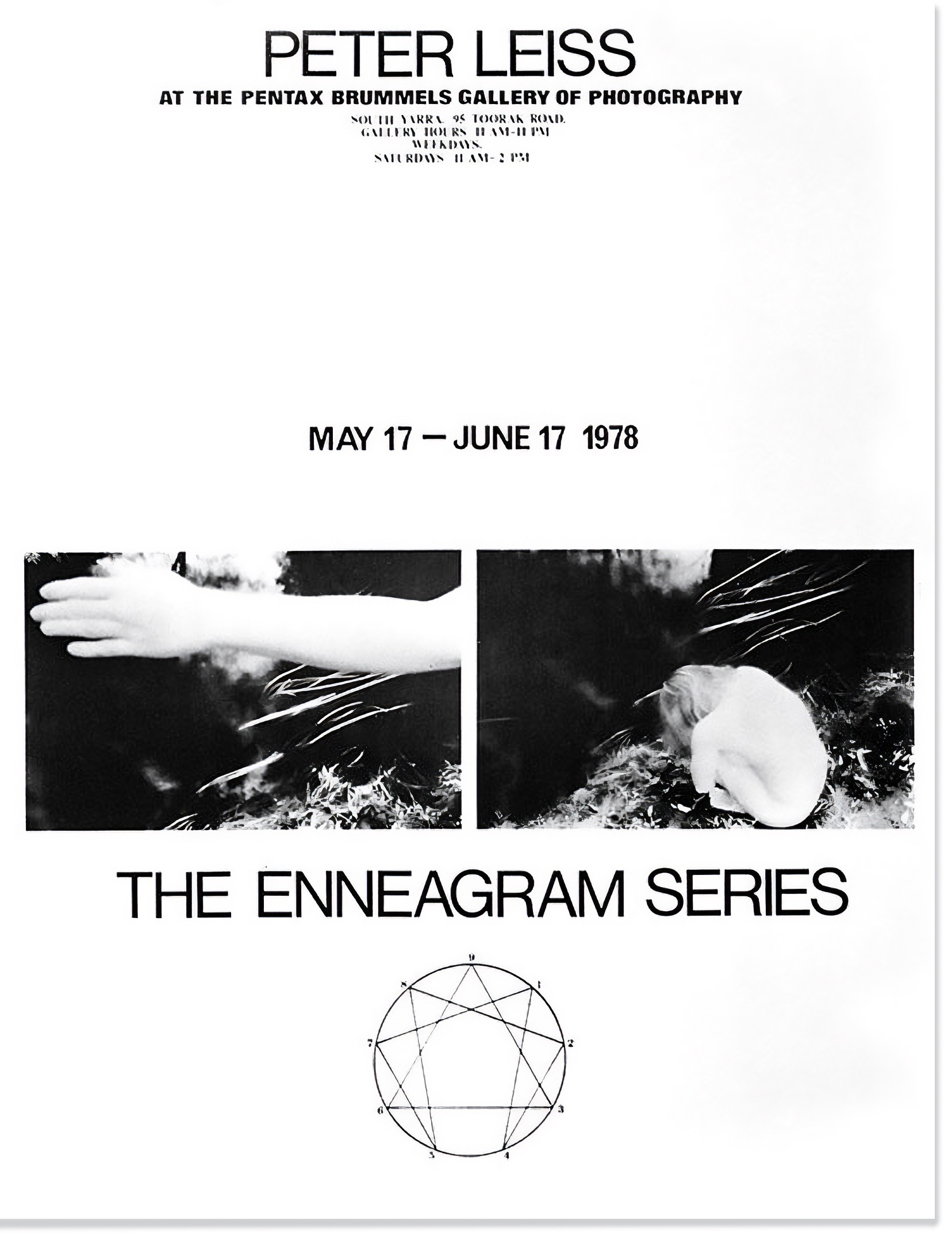 Over 17 May-17 June 1978, Leiss showed The Enneagram Series, at Brummels Gallery, and Beatrice Faust reviewing the show in The Age presents its diagrammatic arrangement of three groups of nine representing the personality types as a challenge or puzzle, concluding that:
