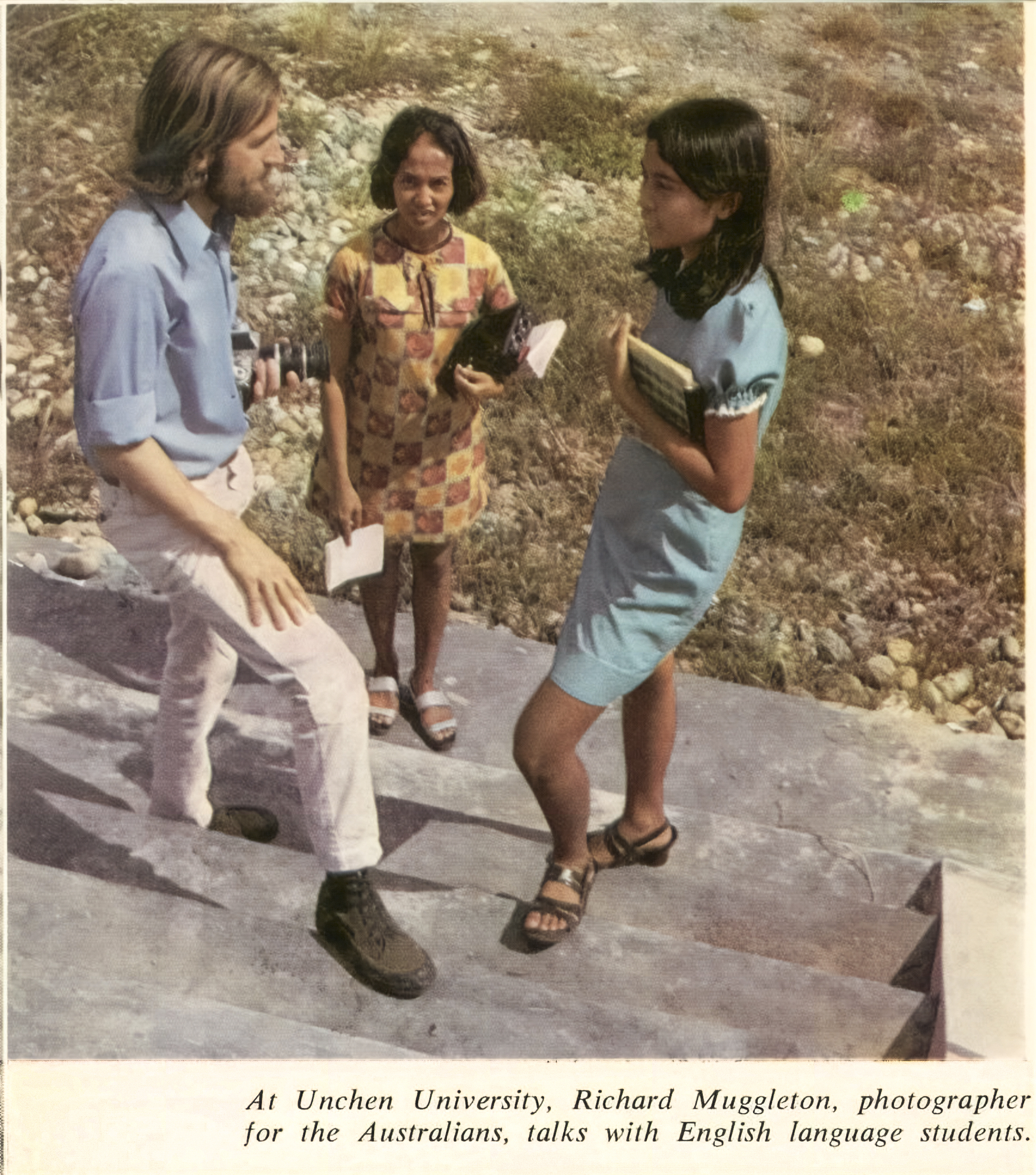 Here Muggleton is talking to students at Cenderawasih University (Universitas Cenderawasih) in Jayapura, Papua province, Indonesia during the time he was there for the expedition, as featured in Hemisphere: An Asian-Australian magazine, November 1973 issue, which reproduces several of his colour pictures of adventures on the Puncak Jaya range where the glaciers were situated.