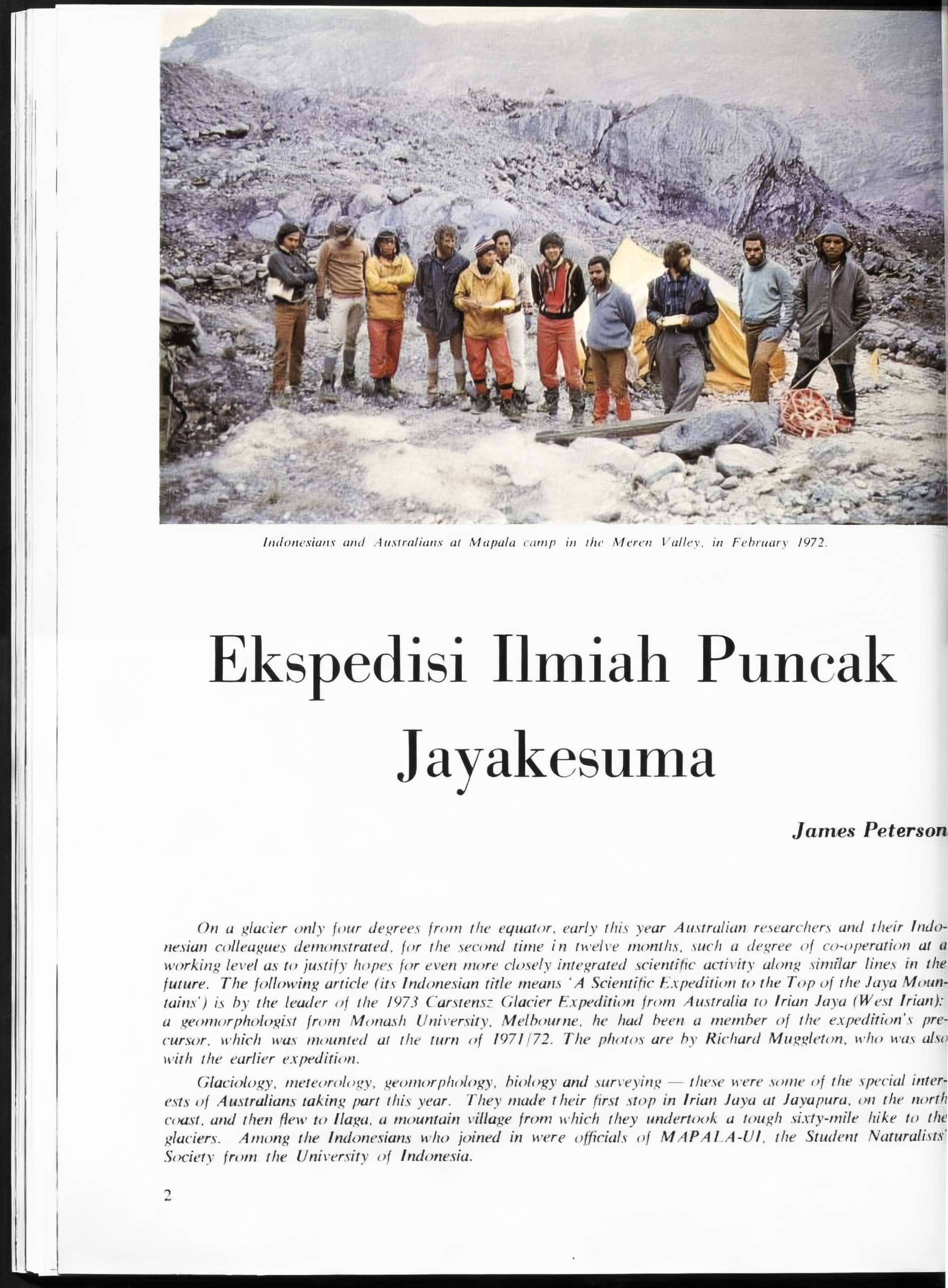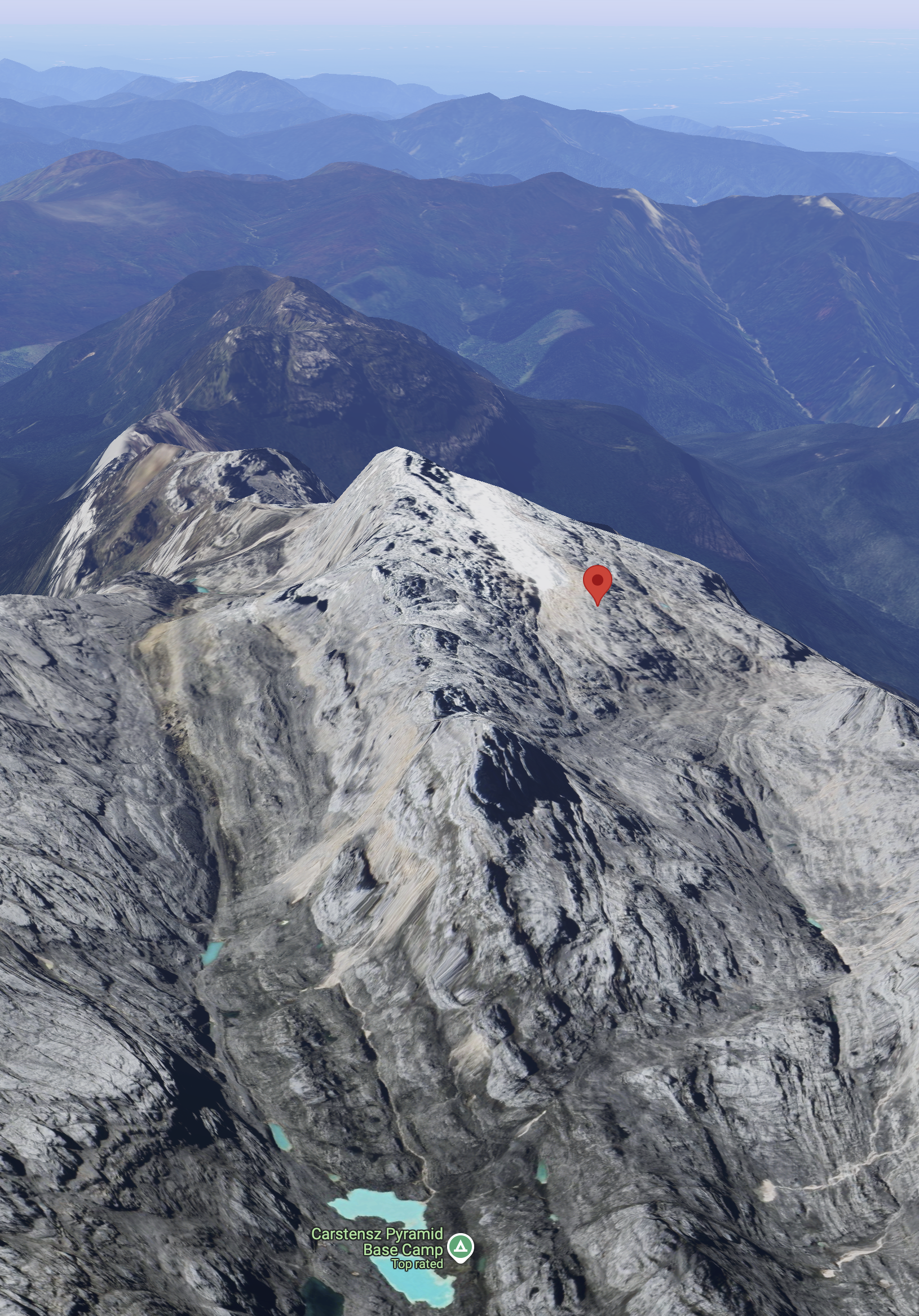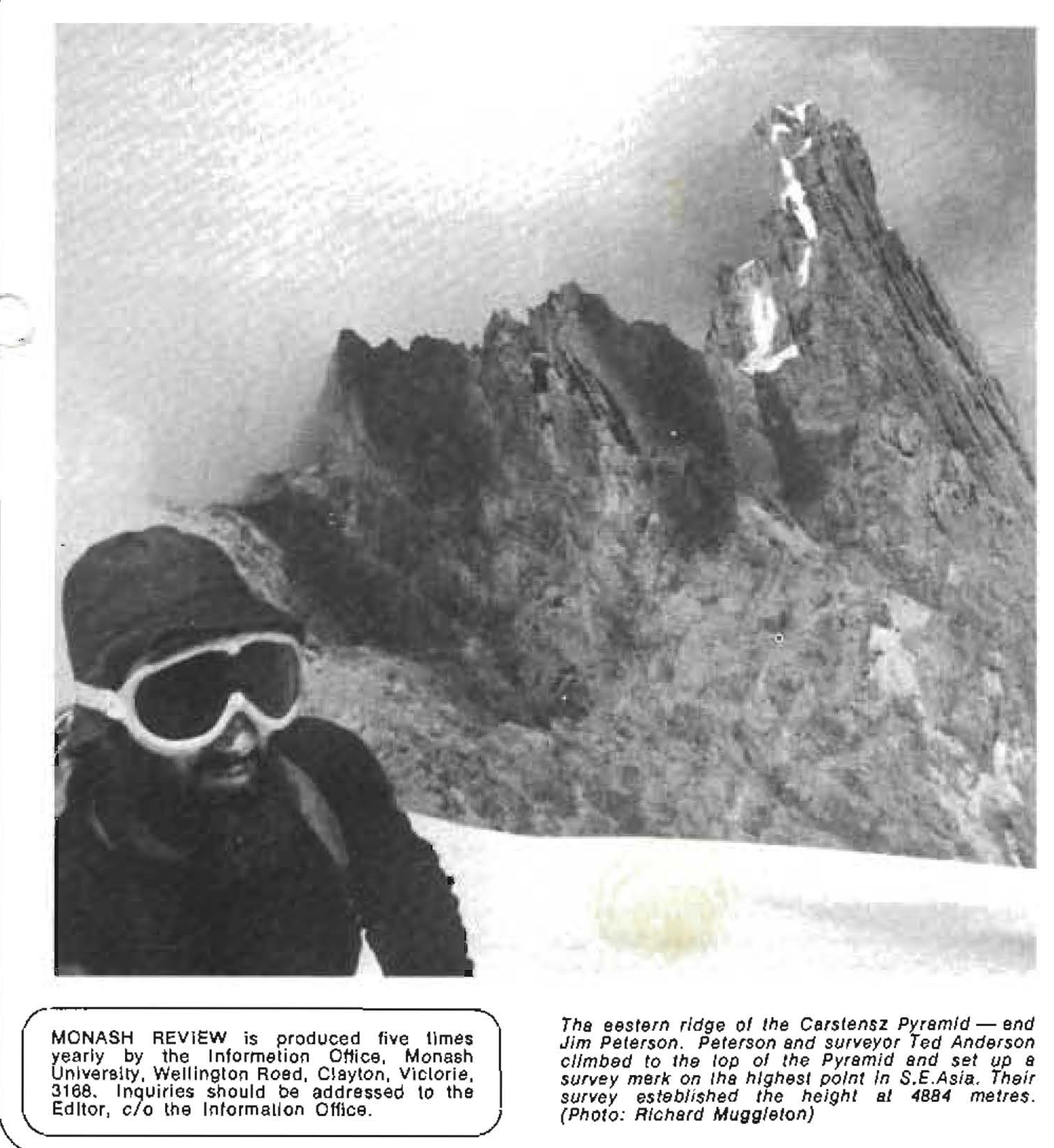 That was written in May 1973—fifty-one years ago!—in the Australian university’s Monash Review. The journal reports on an expedition following a first, also by Dr. J. A. Peterson, lecturer in geography leading a team of geomorphologists, over December 1971-March 1972 to the Carstens and Meren Glaciers (see: Carstensz Glacier Expedition (1971-1972) & Champion, C. Randell & Radok, Uwe (1972). Carstensz Glaciers [sic] Expedition, 1971-72 : preliminary report. University of Melbourne, Meteorology Dept, Parkville, Vic.), which at latitude 4° south, and 4500 metres high are among the world’s tropical glaciers.