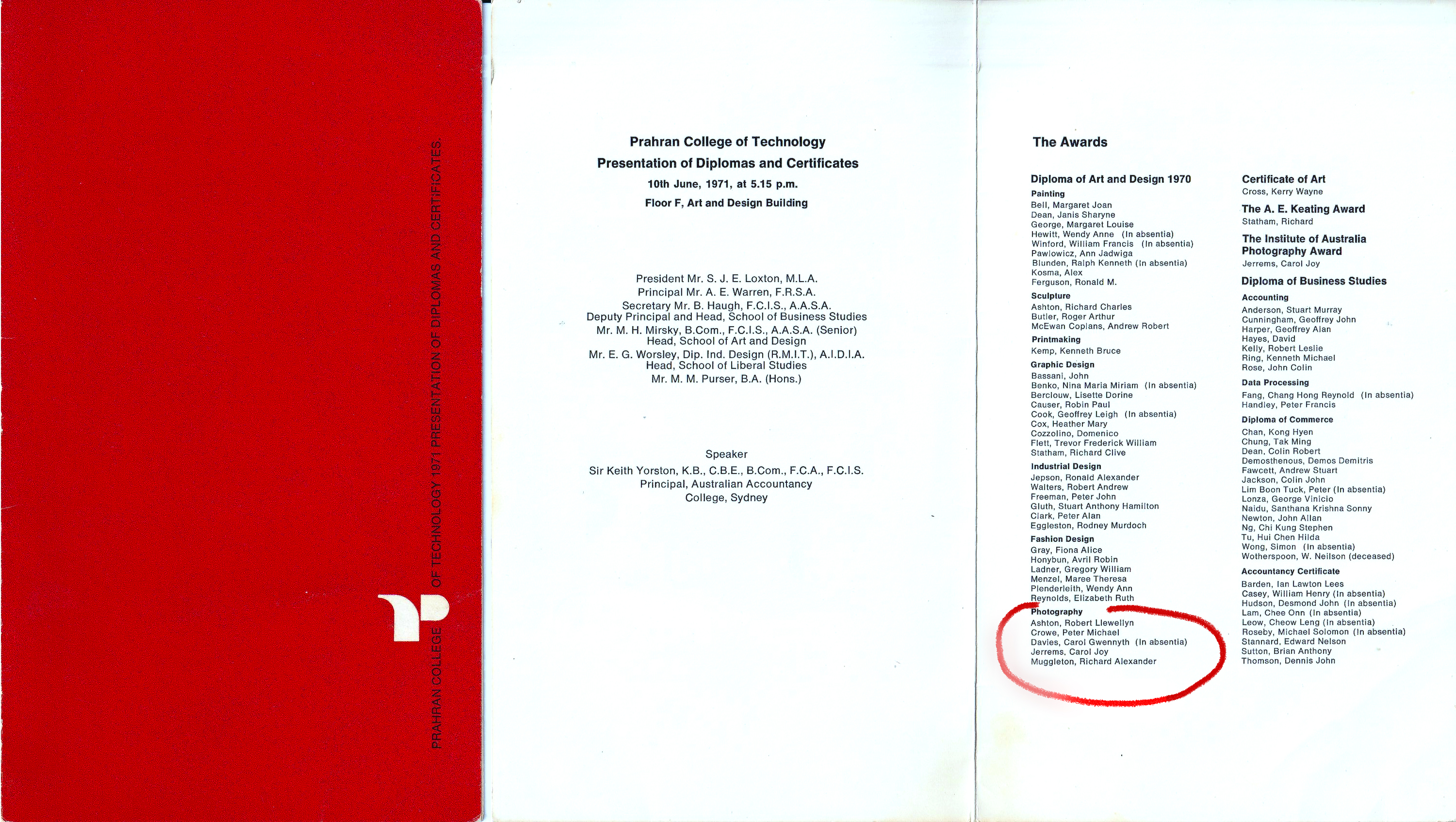 Richard Alexander Muggleton was one of the earlier alumni who graduated with Carol Jerrems in 1970, so was at Prahran 1967-69.