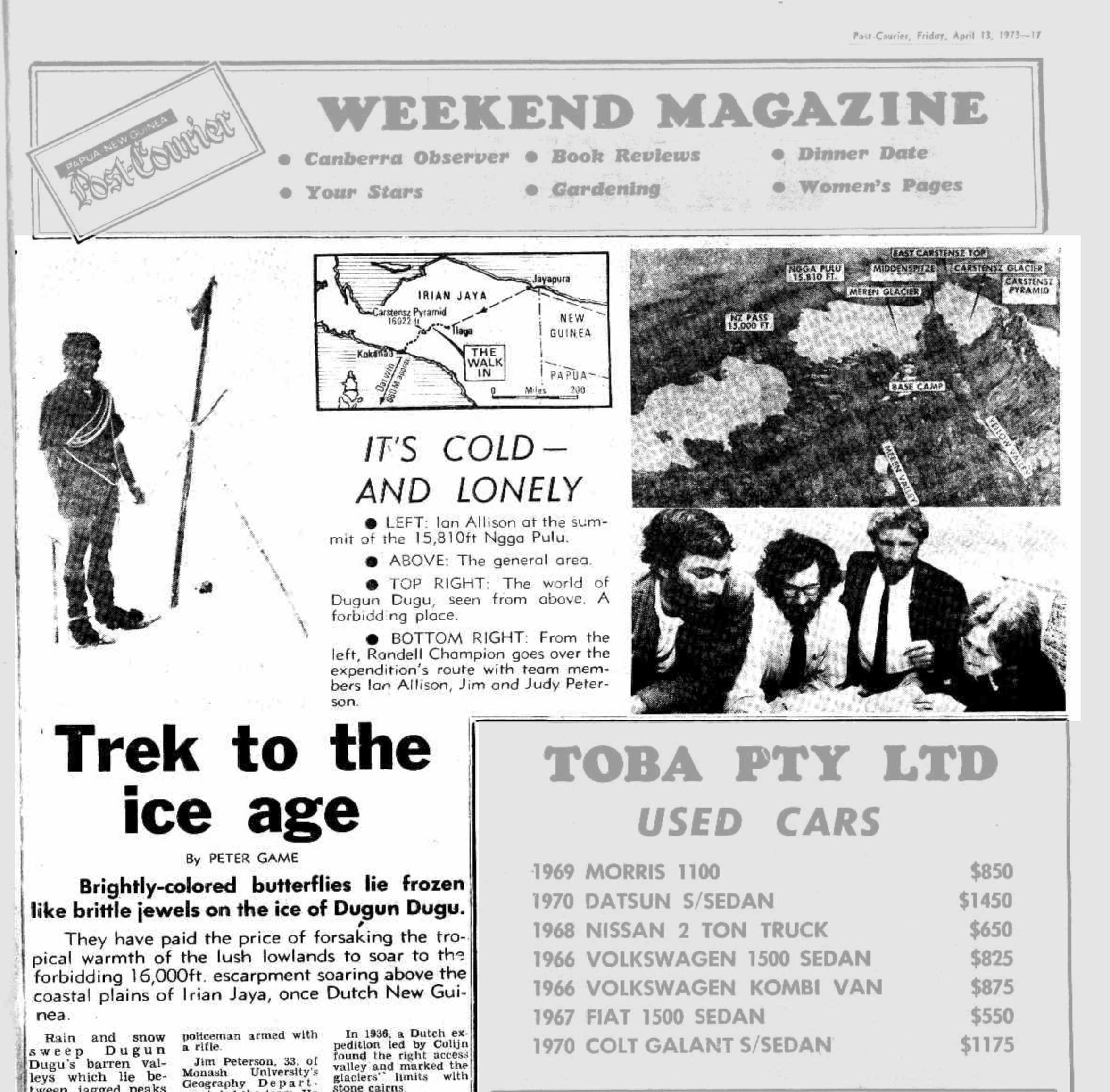 “So, in keeping track of the climatic changes in the atmospheric ‘heat-engine’, data from such remote, high and tropical places as the Carstens area in West Iran are especially useful. This expedition, like the first, was very much a co-operative effort. Ted Anderson, the surveyor, came from the University of New South Wales; Sam Mustamu from Unchen University, Republic of Indonesia. Photographer on both occasions was Richard Muggleton, of Preston and Northcote Community Hospital, Victoria. Logistic support was provided by Freeport Indonesia Inc., a mining company in the area.”