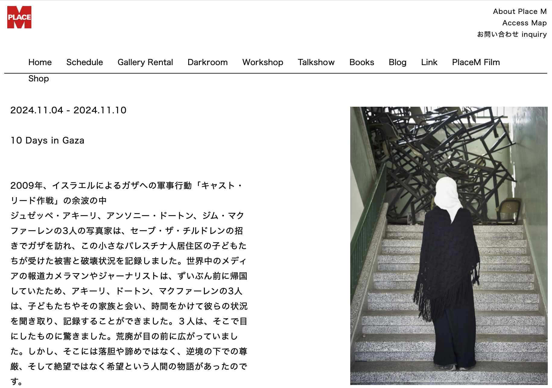 “Later in the year I was back in Tokyo for the Gaza exhibition in another gallery called Place M. It’s the oldest photo gallery in Tokyo, run by Masato Seto who founded it with Daido Moriyama. Again Ishikawa visited almost every day and he took me to the famous photographer’s bar in Golden Gai in Shinjuku, a tiny intimate place attended mostly by photographers. After too many drinks we struggled down the very steep narrow staircase onto the laneway below. These were the very steps that a drunk Masahisa Fukase fell down, resulting in his tragic slow and painful demise. His pictures of crows are unforgettable.”