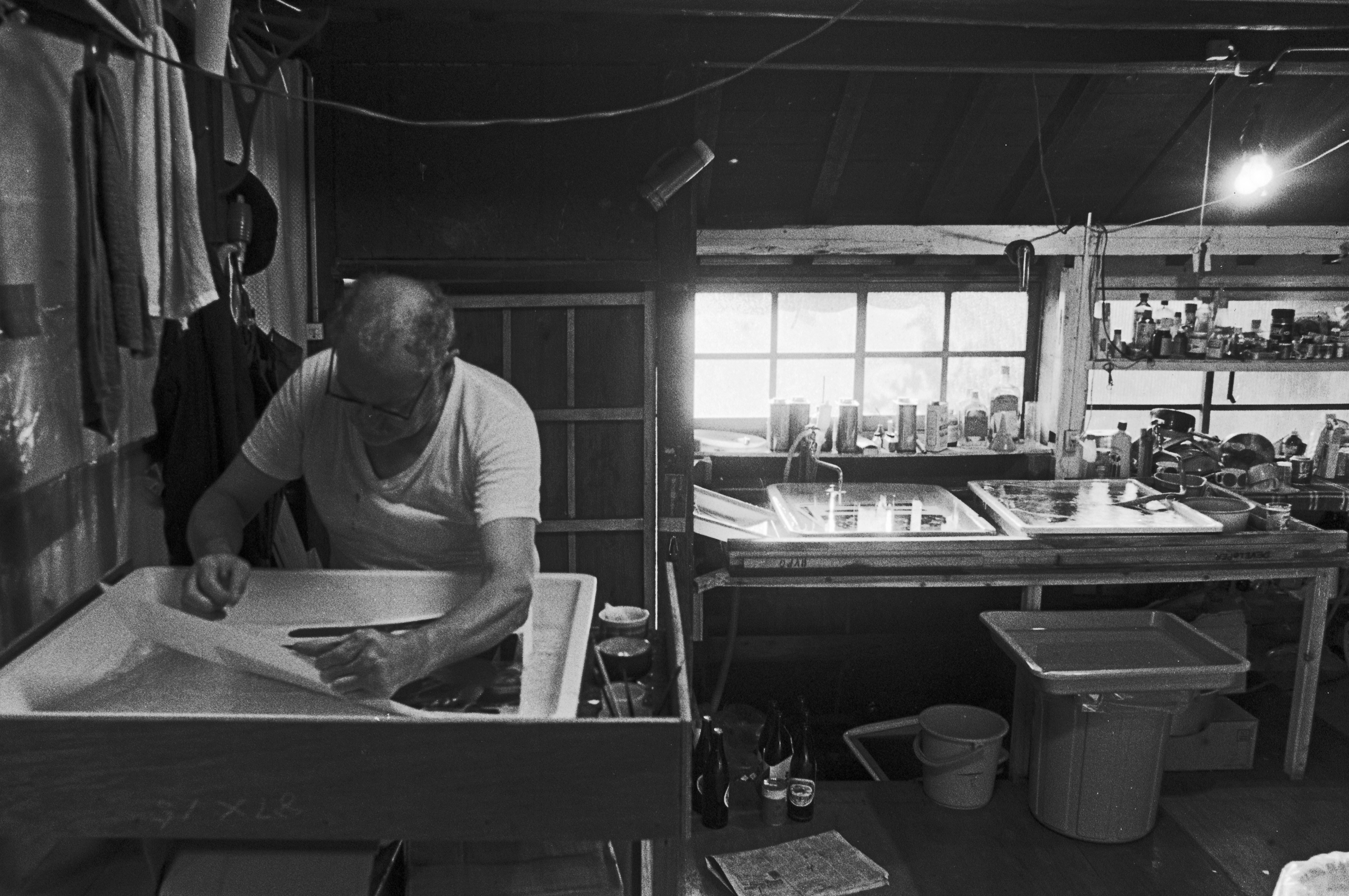 “Finally, at this point, we dried the prints we laboured over. This was done on large mesh screens, and air-drying the prints while being careful not to let them curl up. There were problems, however. During the summer, scarab beetles, moths, and other insects came flying in, and their carcasses and excrements could drop on the prints. And on a windy day in the winter, dust would fall onto the prints directly from the roof. Eugene could not put up with that, and so he asked Mr. Mizoguchi, the landlord, who was a retired carpenter, to fix the ceiling.