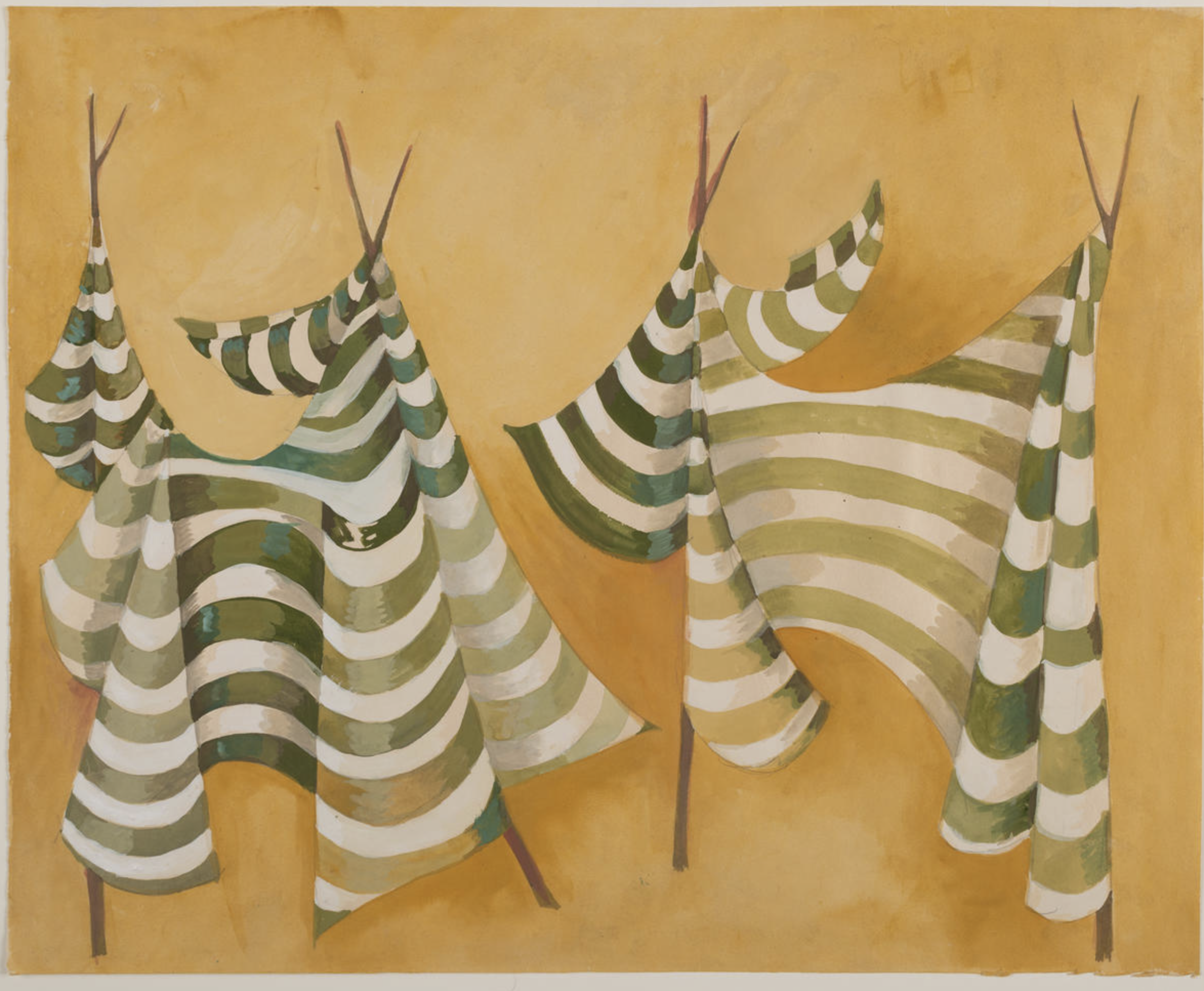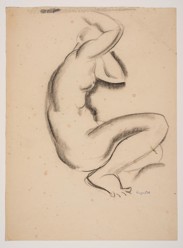Dorothy Braund approached Bell in 1943 to study art with him but as she was still only seventeen, Bell recommended that she enrol at the National Gallery of Victoria Art School. Instead she began studies at RMIT in 1944 but found covering industrial design, lettering, clay modelling and drawing too busy, so in 1945 studied at the National Gallery School under William Dargie, Murray Griffin, and Alan Sumner. The latter taught the modernists an analytical approach she enjoyed and she won prizes for figure drawing and still-life painting. Sumner sent Braund and other students to the George Bell for extra study and he became a major influence in her work before she subsequently studied in England 1950–51, then taught art in Melbourne schools Lauriston, St Catherine’s and Rossbourne House. After meeting John Reed she joined the Contemporary Art Society in 1952, where she became a regular ‘Thursday night’ participant at George Bell Studio from 1954. She hitch-hiked in the 1950s and 60s across Europe to Italy, Pakistan, Persia, Turkey, India and Asia seeing the galleries and exploring, and in 1958 visited George Johnston and Charmian Clift and their three children on Hydra. She was a supporter of Bell’s pedagogy and taught some of his former pupils after Bell’s death in 1966. Braund, here aged about forty, ignores Beck’s camera and, perched on a sturdy studio stool in front of a paint-encrusted trolley, is preoccupied with her painting which she squints at with some bemusement. Her strikingly striped pedal-pushers rhyme visually with the interleaved forms on the canvases behind her.