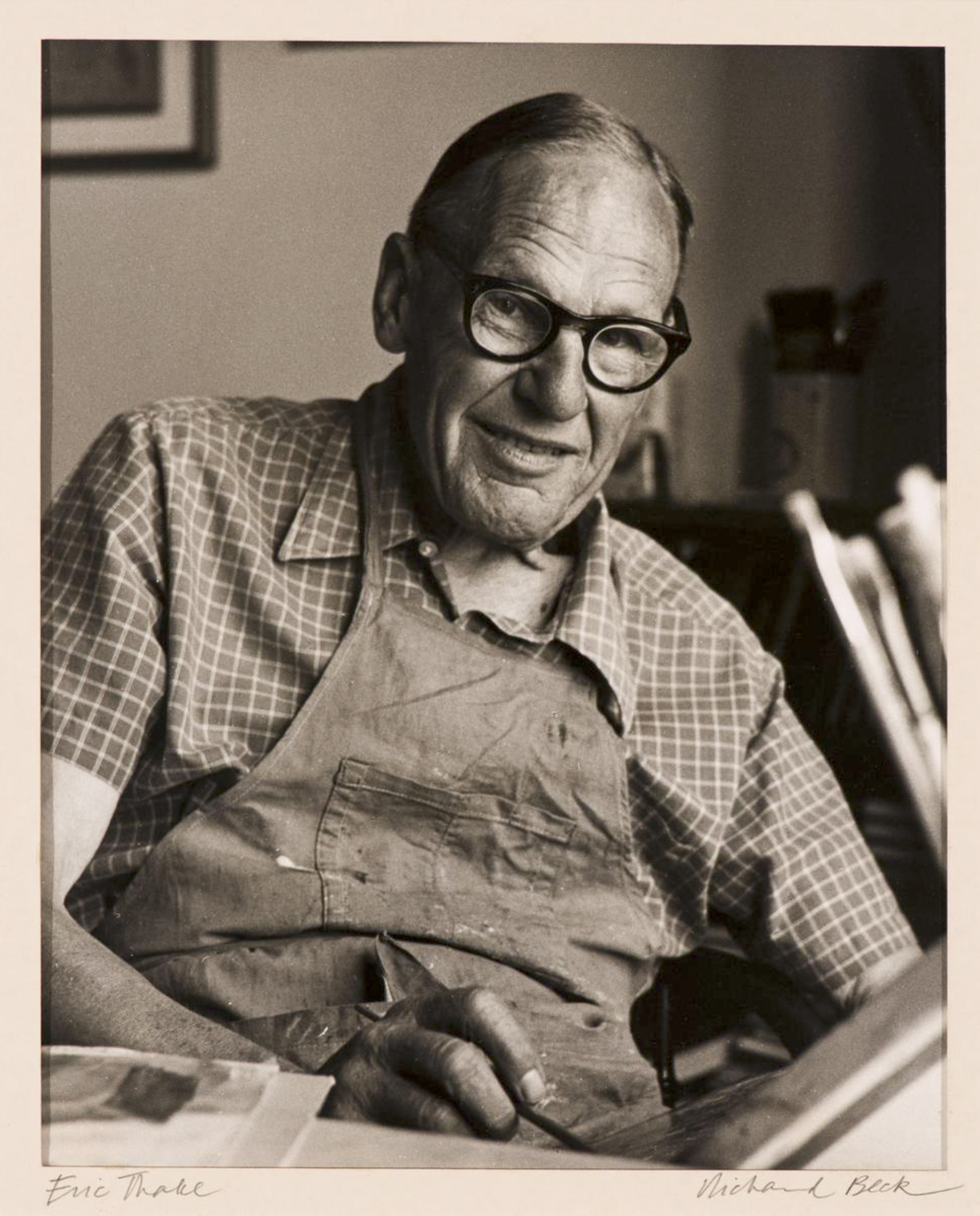 The third photographer, of two portraits of artists in A Modern Turn, is Richard Beck (1912–1985, and not b.1945 as recorded in the CAM online catalogue). Trained at the Glasgow Academy and Sevenoaks School in Kent, the Slade School of Art in London and the Blocherer School in Munich before he migrated to Australia in 1940, Beck served with the Australian Imperial Force (AIF) in WW2 and in 1943 married Joan Barbara Isaacson. After the war, Beck established Richard Beck Associates, design consultants for advertising and industry, producing packaging, corporate image design, exhibition and general advertising work – including freelance designs for several Melbourne advertising agencies including George Patterson, Patons Advertising, Castle Jackson Advertising, and Walker, Robertson, Maguire. His portraits are distinctive in their animation; Eric Thake, the printmaker only eight years older than he, and also a significant photographer, joins cheerfully in the photographic process which foregrounds his art-making.
