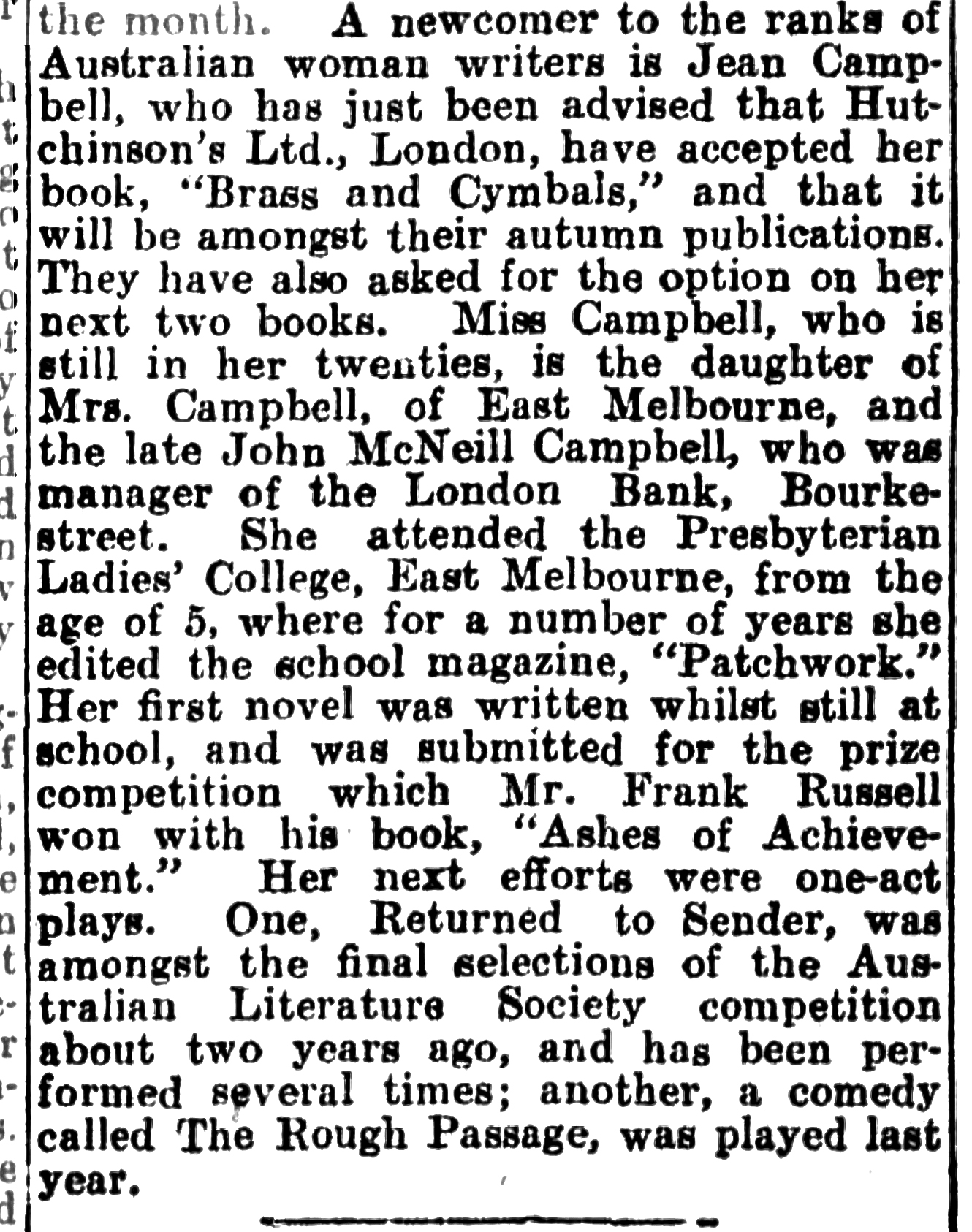 The Sievers is in fact a double portrait of actress, writer and critic Jean Campbell (1901-1984) writer of five novels for William Hutchinson, publishers, in London, which also produced fourpenny magazine style romance novels for New Century Press, Sydney; “A new title every month.” Her novels and articles for the Australian Journal were serious writing, but Bitter Honeymoon, Passion from Peking and Her Fate in the Stars were bread and butter.