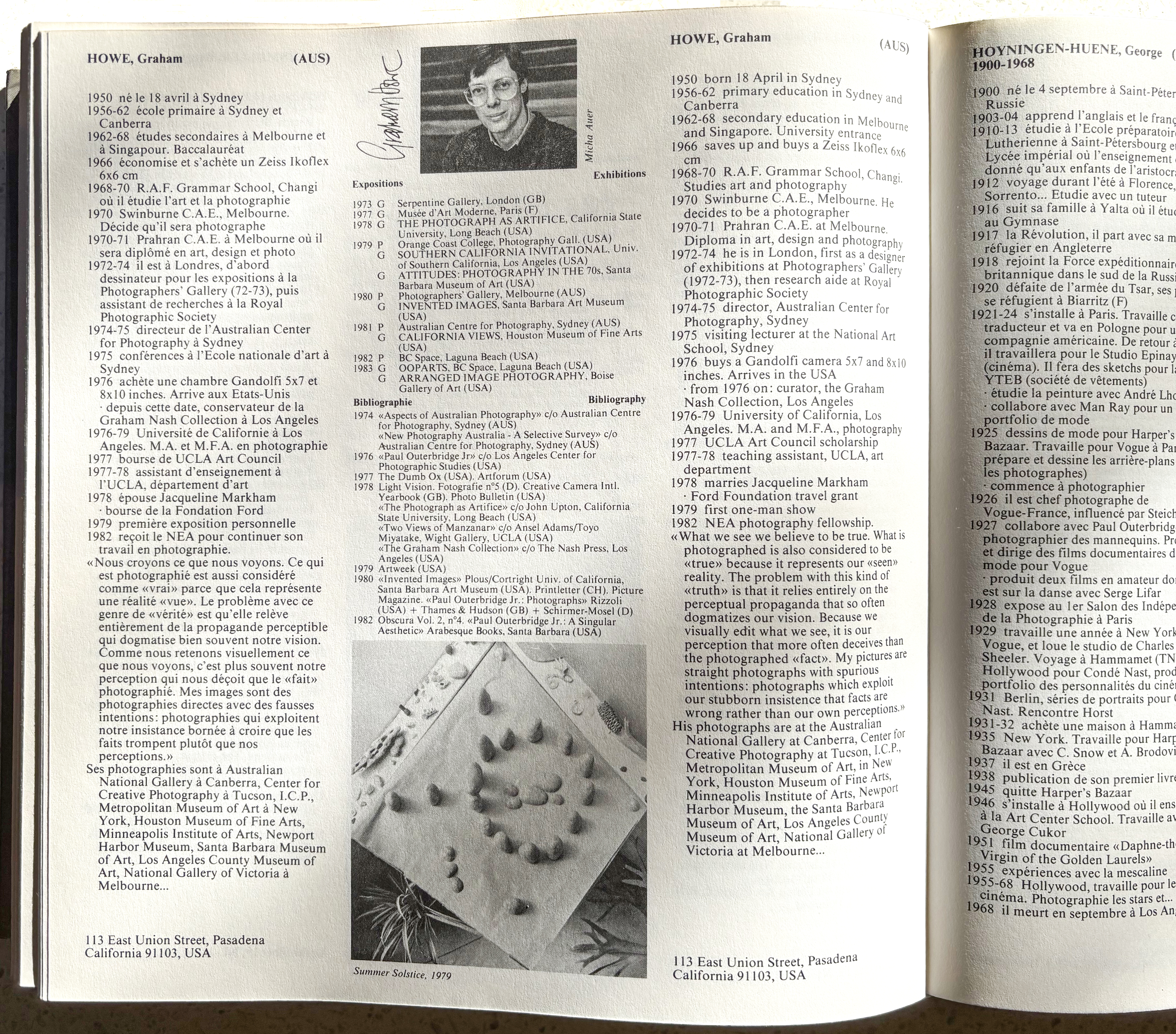 To look at Australian photographers’ entries in the print version one finds well-knowns Harold Pierce Cazneaux, Max Dupain, Helmut Newton, Rennie Ellis, David Moore, Max Pam, and Graham Howe and Grant Mudford who have spent most of their lives in America, and two who are now quite obscure; photojournalist Bob Davis who had set up a photo agency in Hong Kong in 1983, and art photographer Stephen Roach, identified in the book as Stovin Reach, who went to live in Italy. Mudford and Newton both moved away from Australia to practice overseas. Howe’s entry below is typical of those throughout the Encyclopaedia; the portrait, usually by Michel Auer, with the photographer’s signature as they would sign a print, a biographical timeline in French and English, list of exhibitions, a bibliography of works by and about the person and a sample of their work.