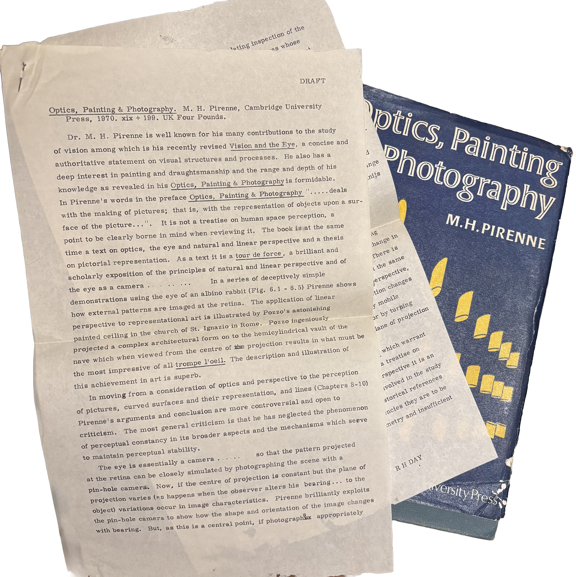 Reaching into his bookshelf he took out a volume and, giving it to me, suggested that I might be interested in the author’s use of the pinhole camera in exploring the illusion of perspective. Later, I found folded into the book typewritten copies of his review of it, the Belgian Maurice Henri Pirenne‘s Optics, Painting and Photography of 1970.