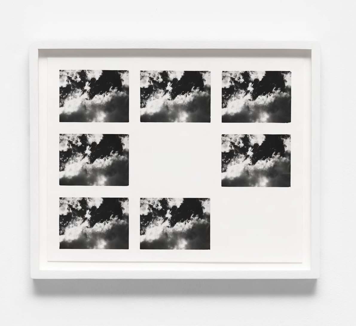 Clouds can move so slowly—“everything is the same” but no, “something is different”—a motion so subtle that we must concentrate to perceive it. Here the viewer is forced into labour, to stare long and hard at the Blind Spots in the Linear Trajectory prints—each painstakingly printed in the darkroom in exact grids on one sheet—until one becomes convinced that there is no difference—but wait, do the white clouds ‘fray’ the corners here and there as the mask shifts incrementally between each exposure? Interrupting duration and our close attention, the missing frames ‘blink’.