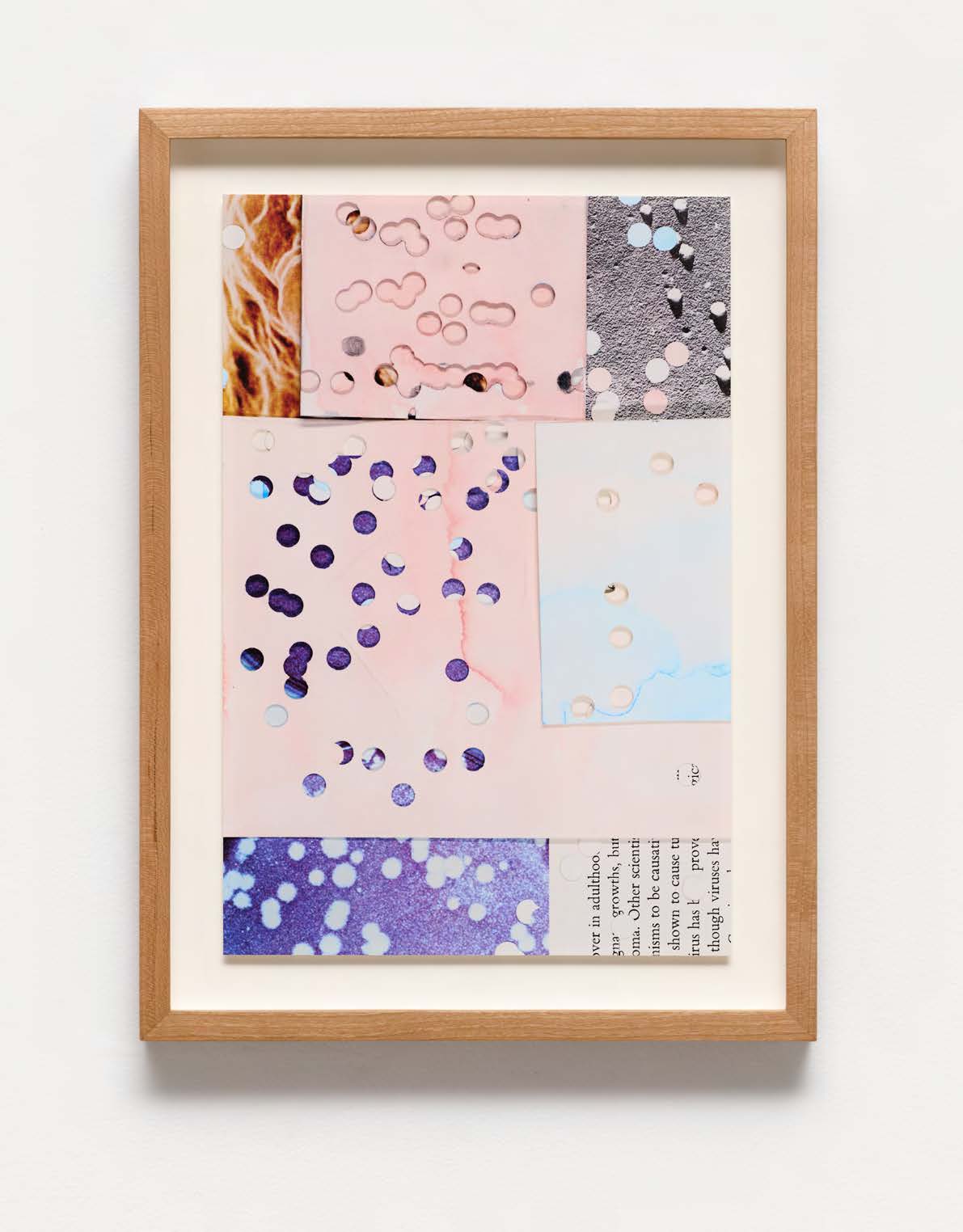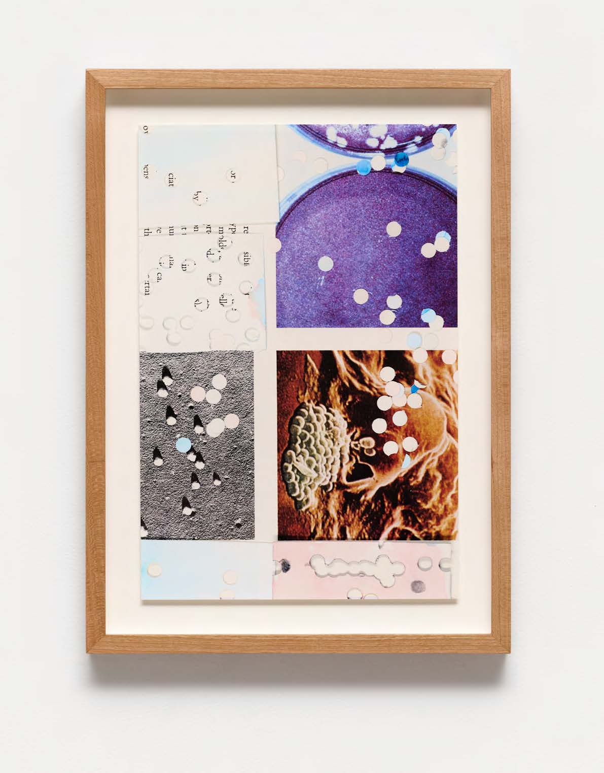 Fragmentation is its most forceful in affect in Carey’s series of Divergences which appear on walls surrounding the sculptural work Everything’s the Same, Everything’s Different which rears up from the floor below those images—a trapdoor into the exhibition. Examination of the text and images, seen in her pigment print copies of collages through the punch-holes, one finds hints of a physical threat; spots as signifying the deadly spread of viruses and cancer.
